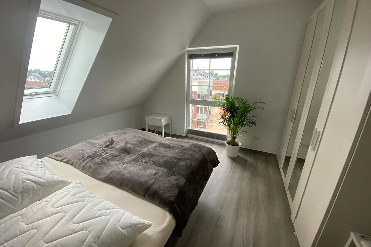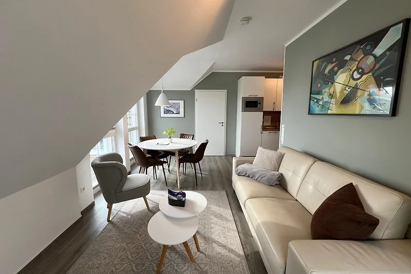 Es erwartet Sie eine gemütliche Dachgeschosswohnung mit traumhaftem Blick über Grömitz mit Blick bis zur Ostsee. Der Wohn-/Essbereich mit leichten Dachschrägen ist mit einem grossen gemütlichen Esstisch und 6 Stühlen sowie einer hochwertigen Wohn/Schlafcouch (Liegefläche 160cm x 190cm) für zwei Personen ausgestattet. Die offene Küche ist eine moderne und voll ausgestattete Einbauküche.