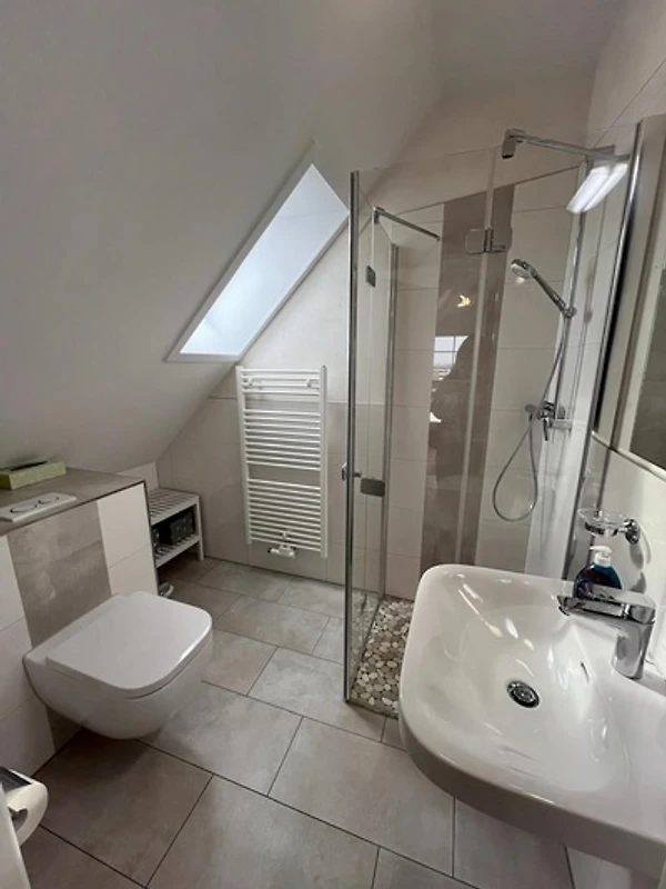 Das moderne Badezimmer verfügt über eine ebenerdigen Dusche, einen beheizbaren Handtuchhalter und einen Föhn.