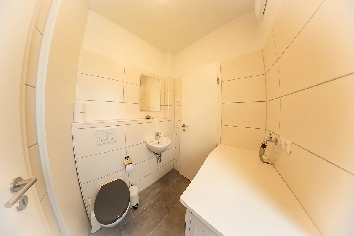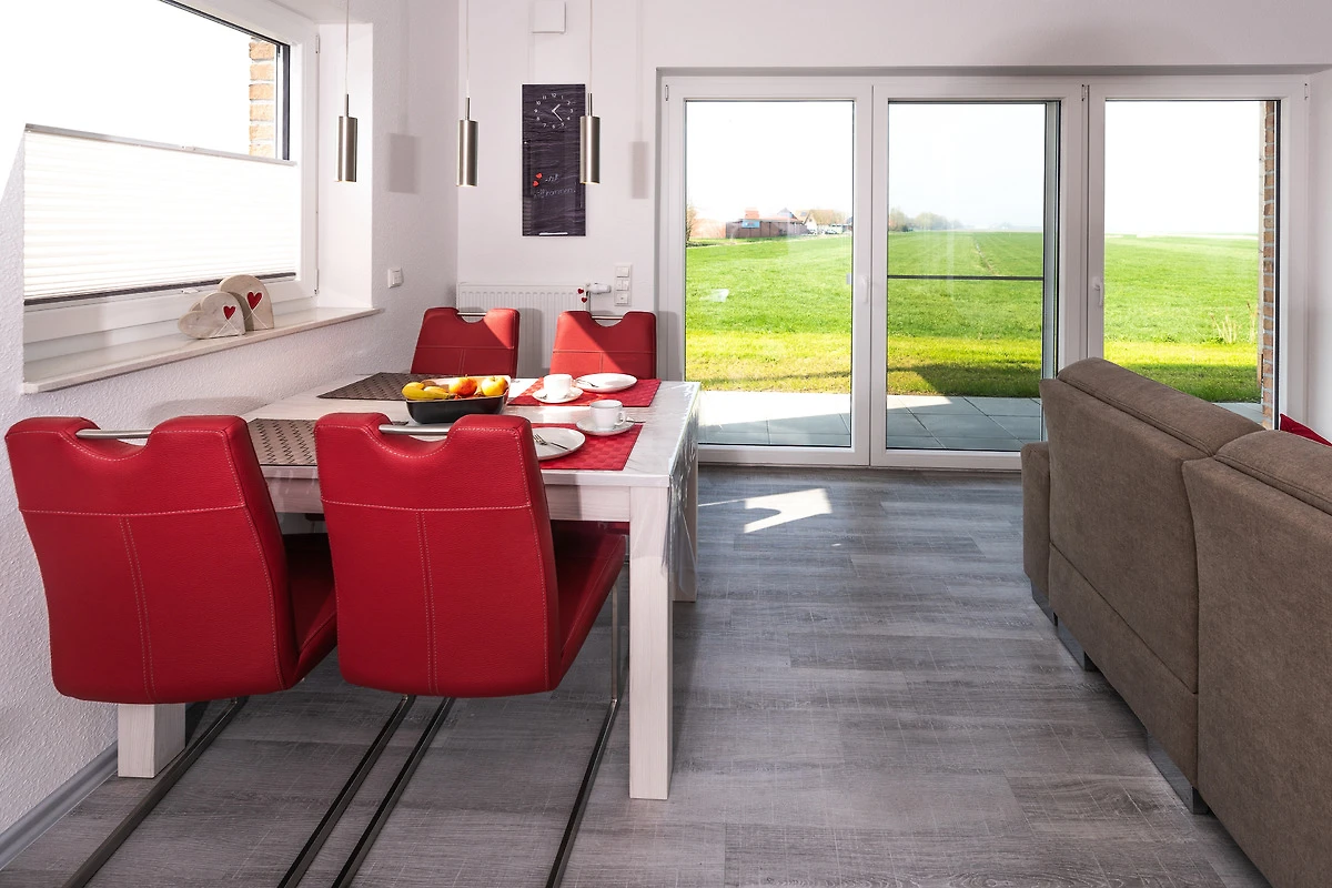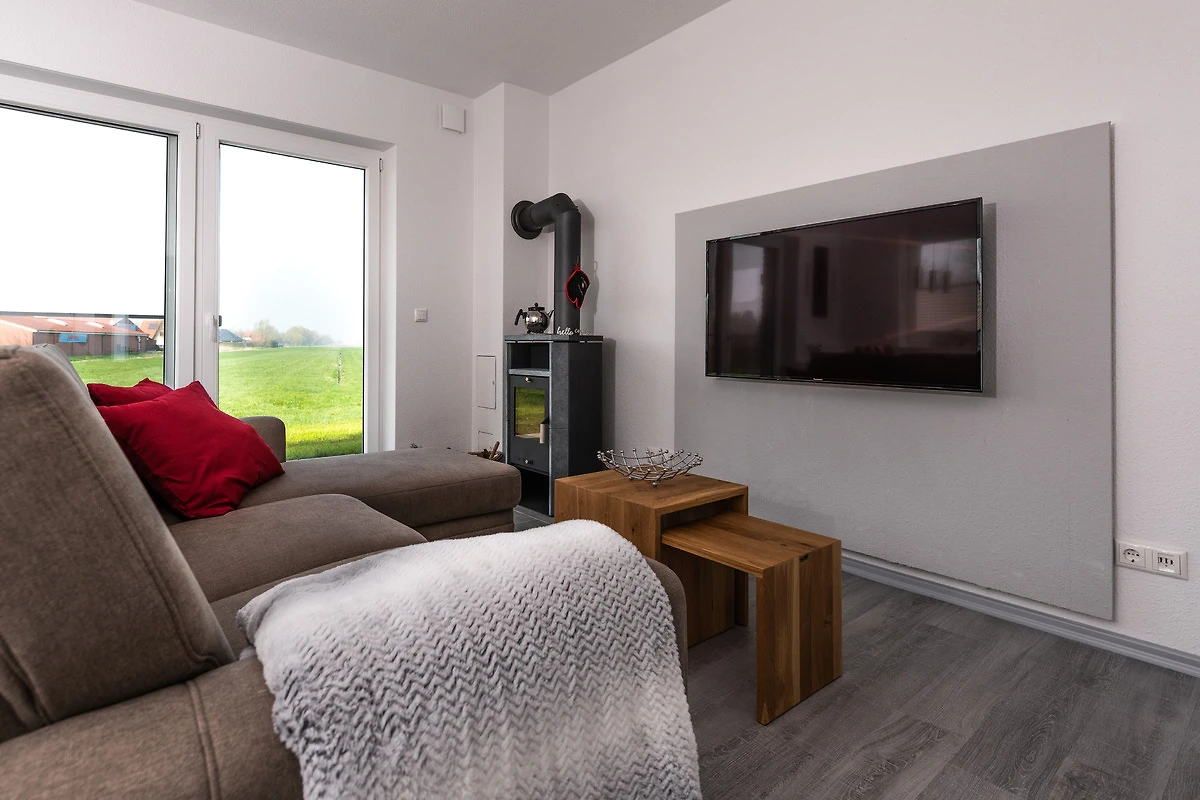 Dieses gemütlich eingerichtete Ferienhaus hat im Erdgeschoss ein offenes Wohnzimmer mit Küche und Essecke. Ein kleines Bad mit WC und Waschbecken ist vom Flur aus erreichbar, dort ist auch eine Waschmaschine fest installiert. Im offenen Wohnzimmer können Sie an schönen Abendstunden vom Sofa aus dem Anblick des Kamins geniessen. An der Wand befindet sich ein grosser Flachbildfernseher. Die offene Küche mit Essecke ist sehr gut ausgestattet. Mit z.B. Geschirrspüler, Kühlschrank, Backofen, Mikrowelle, Kaffeemaschine und Wasserkocher und auch sehr geschmackvoll eingerichtet. Vor der grossen Fensterfront zum Deich befindet sich eine Terrasse für Sie allein mit Gartenmöbeln. Im oberen Stockwerk befinden sich die Schlafräume, das grosse Bad mit Dusche / WC und einer sehr schönen Sauna. Im grossen Schlafzimmer befindet sich ein Doppelbett, sowie ein Flachbildfernseher.