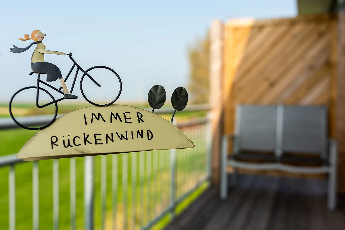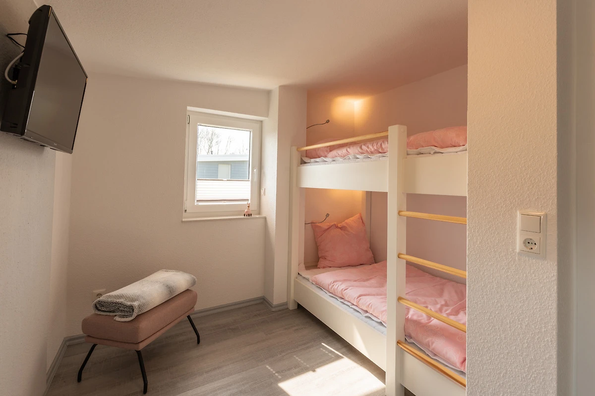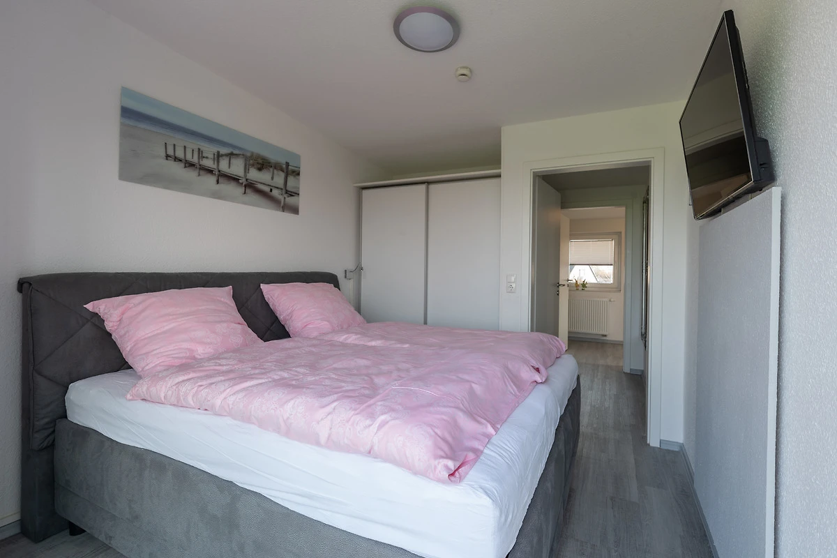 Im Kinderzimmer ist ein Etagenbett vorzufinden, sowie ebenfalls ein Flachbildfernseher An dem Schlafraum mit dem Doppelbett ist ein grosser Balkon mit freiem Blick auf das Feld und auf den Deich.