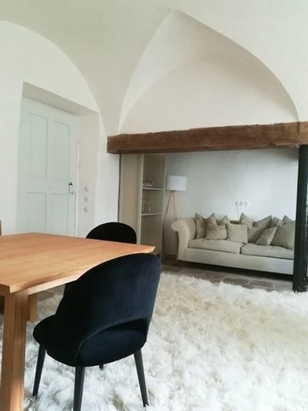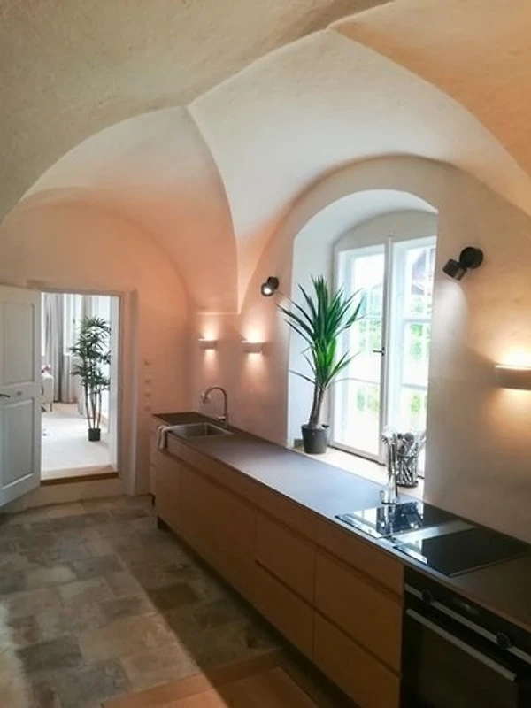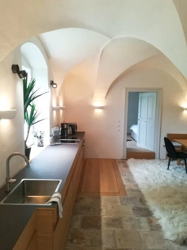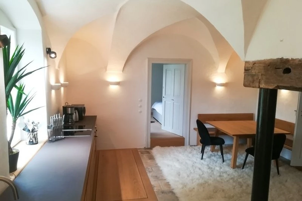Die moderne, hochwertige und voll ausgestattete Wohnküche befindet sich in der ehemaligen Rauchküche und beeindruckt durch ihr bemerkenswertes Gewölbe und den originalen, historischen Steinboden. Im Bereich der ehemaligen Rauchhaube ist eine gemütliche Sofaecke entstanden, welche neben der modernen Essecke zum Verweilen einlädt.