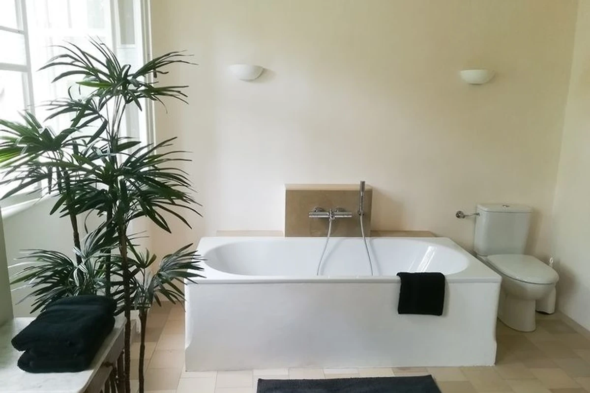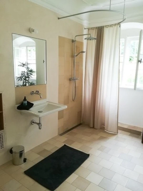 Das geräumige Badezimmer, das ehemalige Köchinzimmer, verfügt über eine moderne und hochwertige Ausstattung mit bodentiefer Dusche, Badewanne und WC. Ein zusätzliches, separates Gäste-WC befindet sich gleich nebenan.