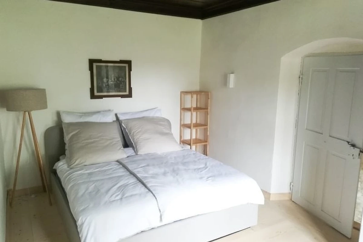 Das Schlafzimmer ist mit einem komfortablen Boxspringbett ausgestattet und bietet einen Blick ins Grüne. Bettwäsche und Handtücher sind inklusive. Die Deckenvertäfelung aus dem Jahre1803 verleiht dem Schlafgemach einen gemütlichen Charakter für entspannte Nächte. Für unsere kleinen Gäste steht ein Reisebett bereit.
