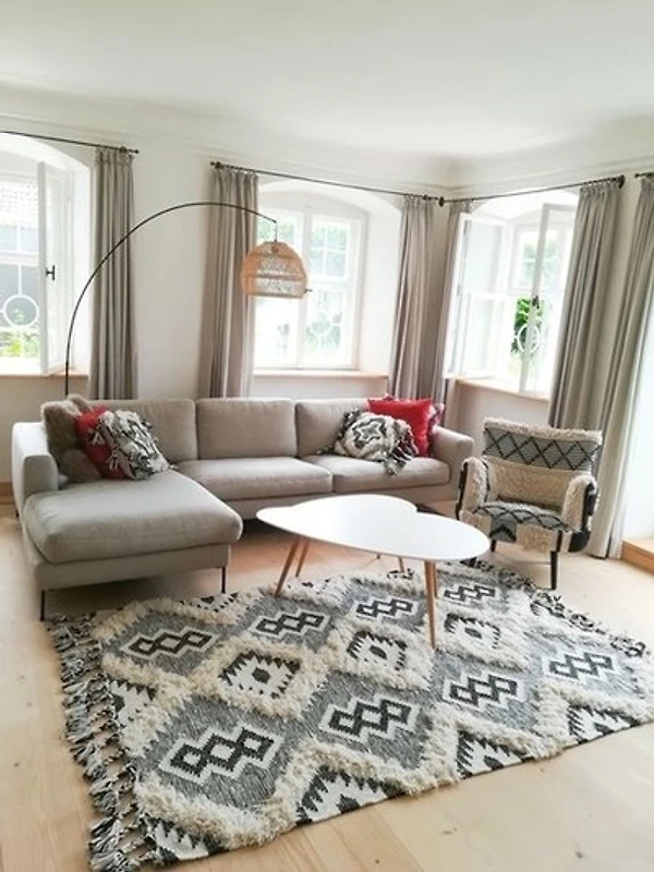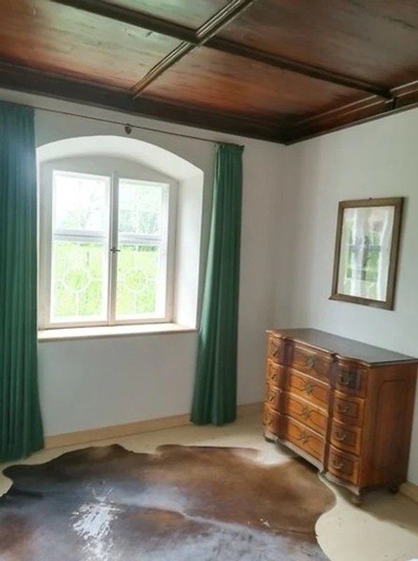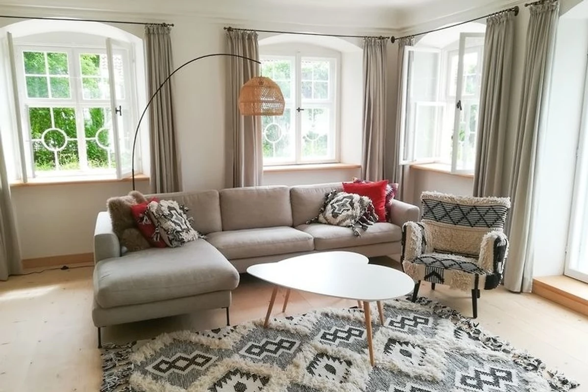 Das lichtdurchflutete Wohnzimmer besticht durch seine vielen historischen Kastenfenster, welche aufwendig restauriert wurden, um den geschichtsträchtigen Charakter des Hauses zu erhalten. Das grosszügige Sofa und der schöne Blick in den umliegenden Garten sind beste Voraussetzungen dafür, entspannte Momente bei uns in Polling zu erleben. Ein zusätzliches Schlafsofa bietet neben dem Hauptschlafzimmer noch zwei weitere komfortable Schlafplätze.
