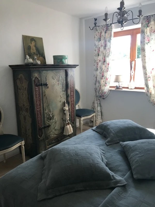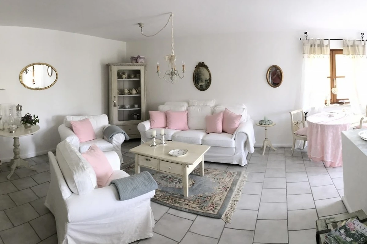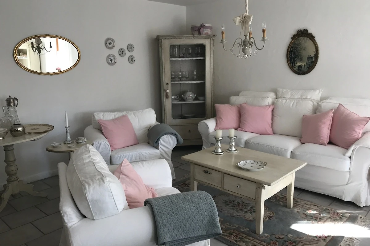 - Wohnraum mit Sofa und zwei Sesseln, SAT-Fernseher, Stereoanlage, WLAN-Internetanschluss. Zwei Vitrinen, ein offener Schrank, Kommode, Couchtisch und Beistelltischchen. Esstisch mit Stühlen