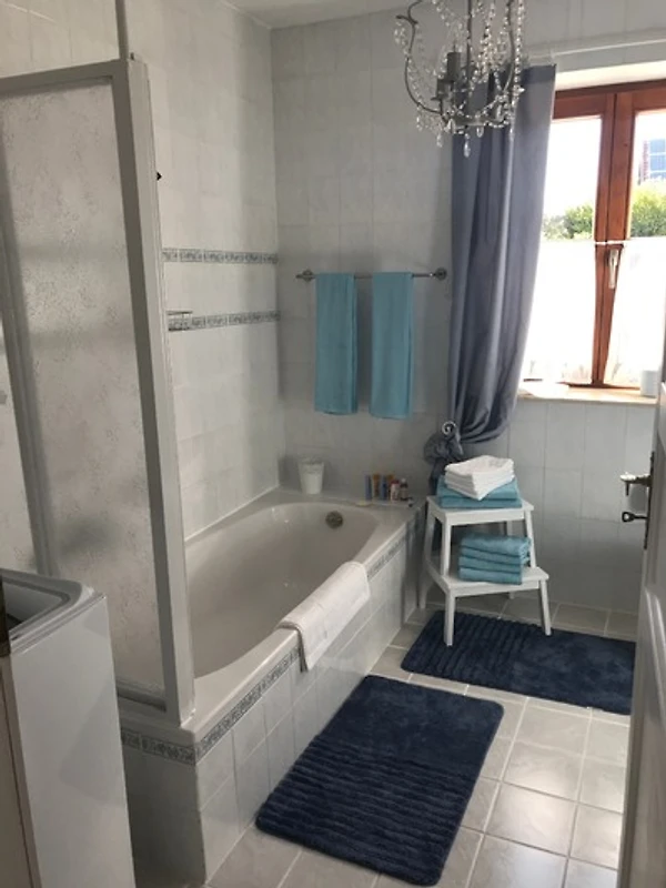 - Badezimmer mit Badewanne (Duschwand), WC und Waschbecken, Haarfön, sowie eine Waschmaschine.