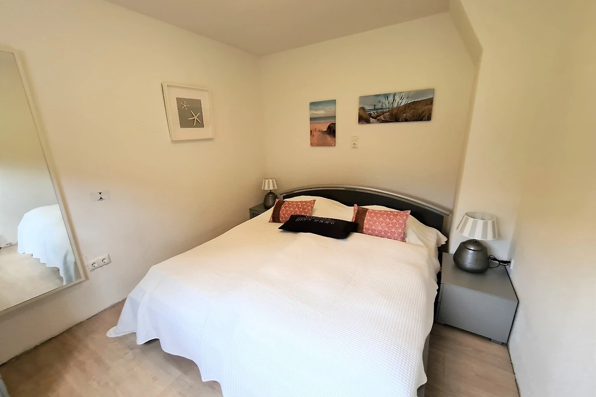 Von dem Wohnzimmer aus gelangen Sie in das Schlafzimmer, ausgestattet mit einem Doppelbett (2x90x200), Nachtschränken und einer Kommode. Zusätzlich finden Sie im Flurbereich einen Kleiderschrank.