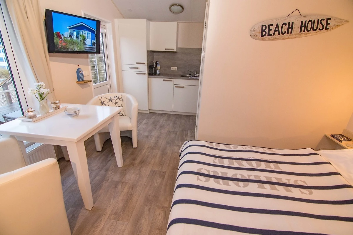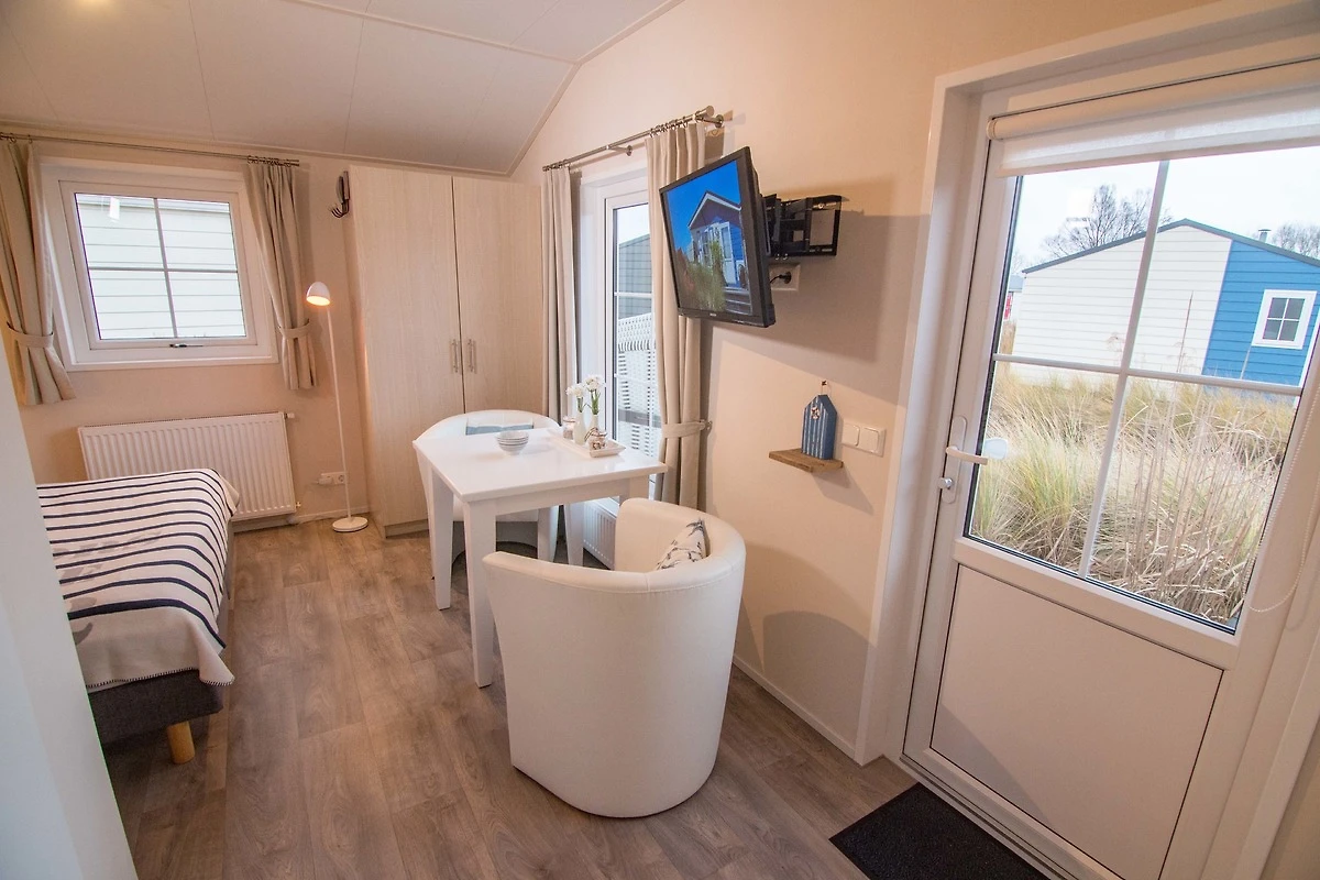 Ideal für den Urlaub zu zweit: unser Welle Ferienhaus verfügt über 20 qm Wohnfläche mit Platz für insgesamt 2 Personen. Hier findet ihr einen Wohn-/Schlafraum mit Esstisch, eine Küchenzeile, ein Doppelbett und ein Badezimmer mit Dusche, Waschbecken, WC und Haartrockner. Auf der Terrasse sind Sitzmöbel, ein Grill und ein Strandkorb vorhanden. Ein Babybett kann zusätzlich aufgestellt werden – bitte beachtet, dass der Wohnraum dadurch eingeschränkt wird.