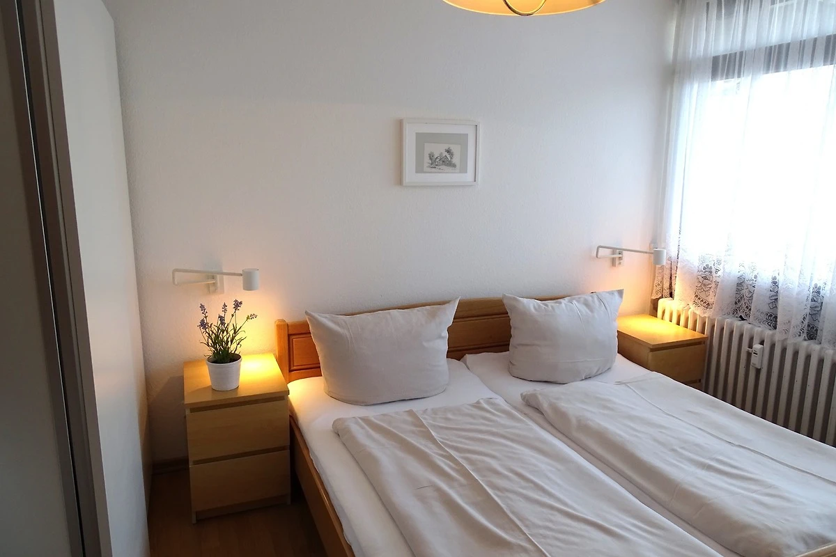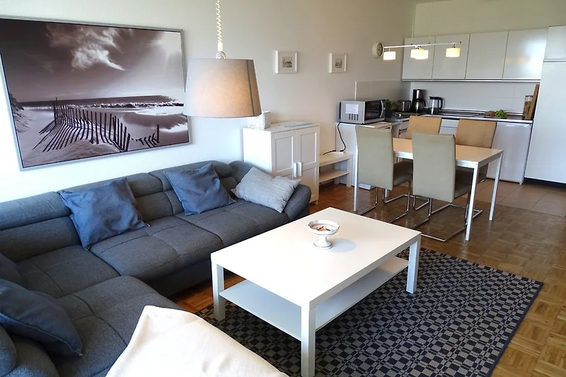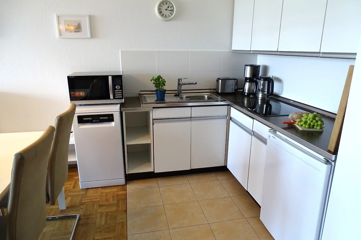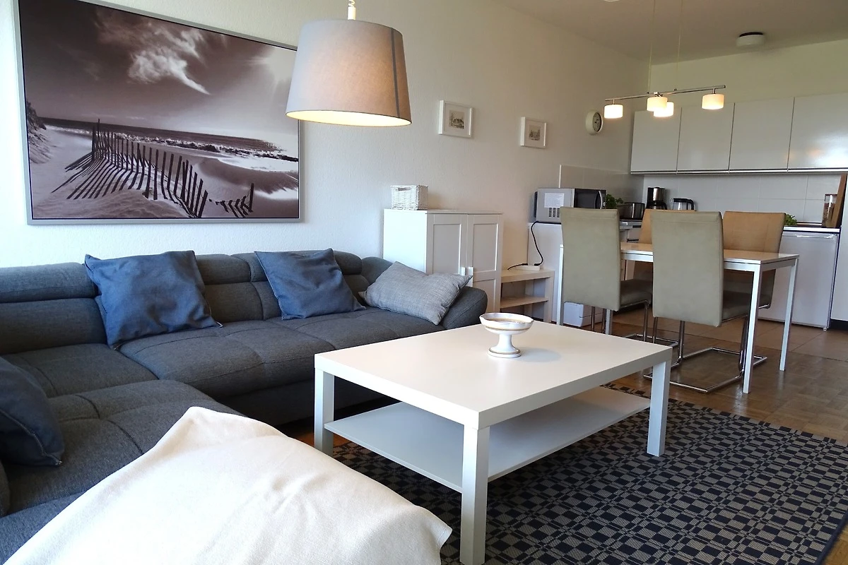 Das Appartement befindet sich in hervorragender Lage, direkt am Deich. Es ist aufgeteilt in Flur mit Garderobe, einem separatem Schlafzimmer mit Doppelbett (180x200cm) mit Kleiderschrank , einem modern gestalteten Duschbad und einem Wohn/-Koch und Schlafbereich im Wohnzimmer. Hier befindet sich eine Küchenzeile, ein modernes Ecksofa und 2 seitlich ausklappbare Einzelschrankbetten. Der möblierte Balkon ist gen Südosten ausgerichtet. Ein direkt am Gebäude überdachter offener Kfz- Garagenstellplatz gehört zum Objekt. Bettwäsche und Handtücher können für den Aufentahlt beim Vermittlungsbüro Wandelt -Strandurlaub Dahme- dazu gebucht werden...
