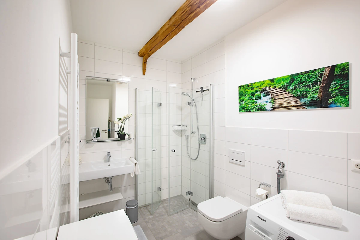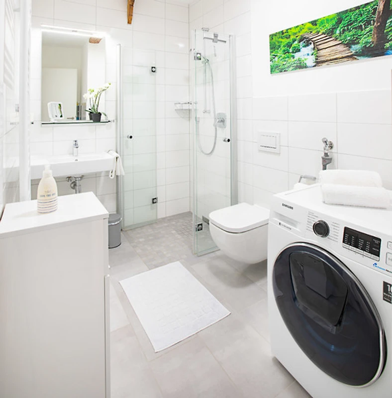 In einem der Badezimmer finden Sie zusätzlich einen Waschtrockner. Kabel-TV und kostenfreies Wifi/Internet stehen ebenfalls zur Verfügung, damit Sie stets verbunden bleiben können.
