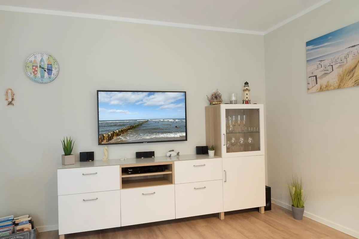 Der grosse Flachbildfernseher mit SAT-TV, ein Blu-ray-Player und eine Soundanlage laden zum abendlichen Unterhaltungsprogramm ein.