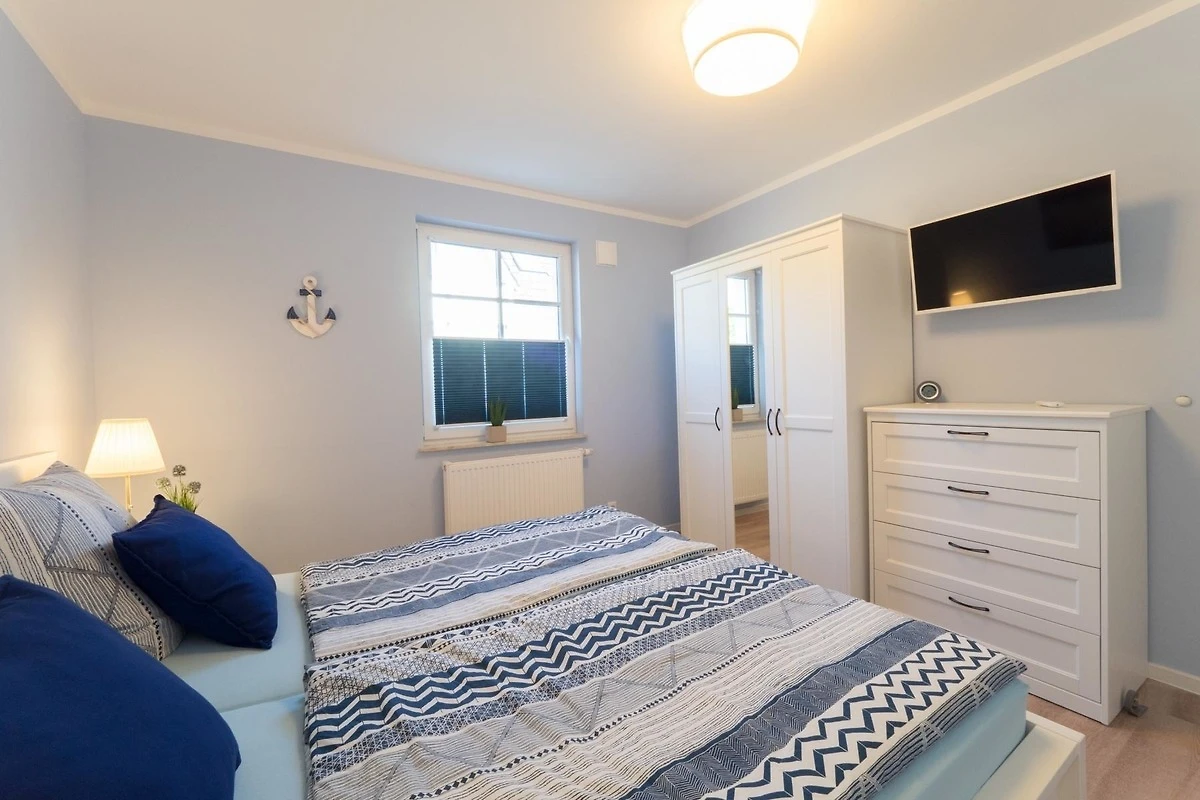 Im separaten Schlafzimmer ist ein grosses Doppelbett (1,80 x 2,00 m) vorhanden. Das Schlafzimmer verfügt über einen Flachbildfernseher.