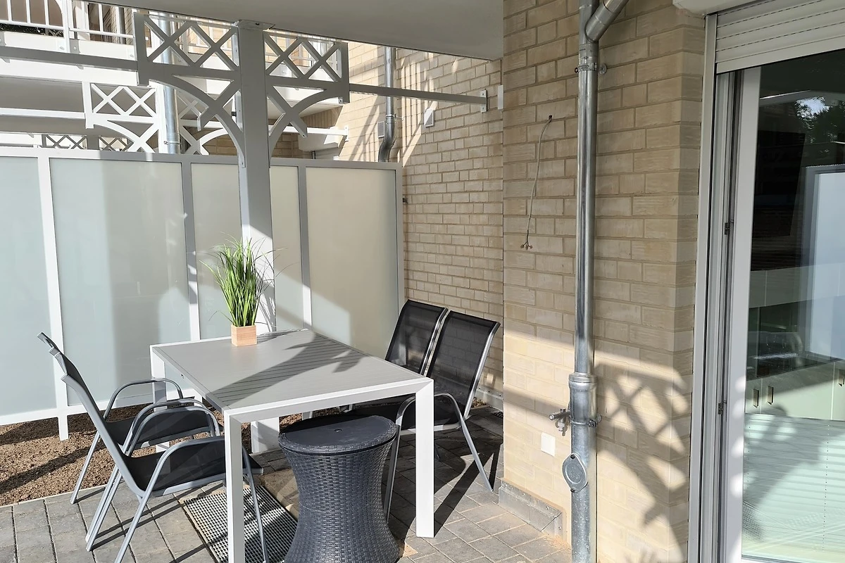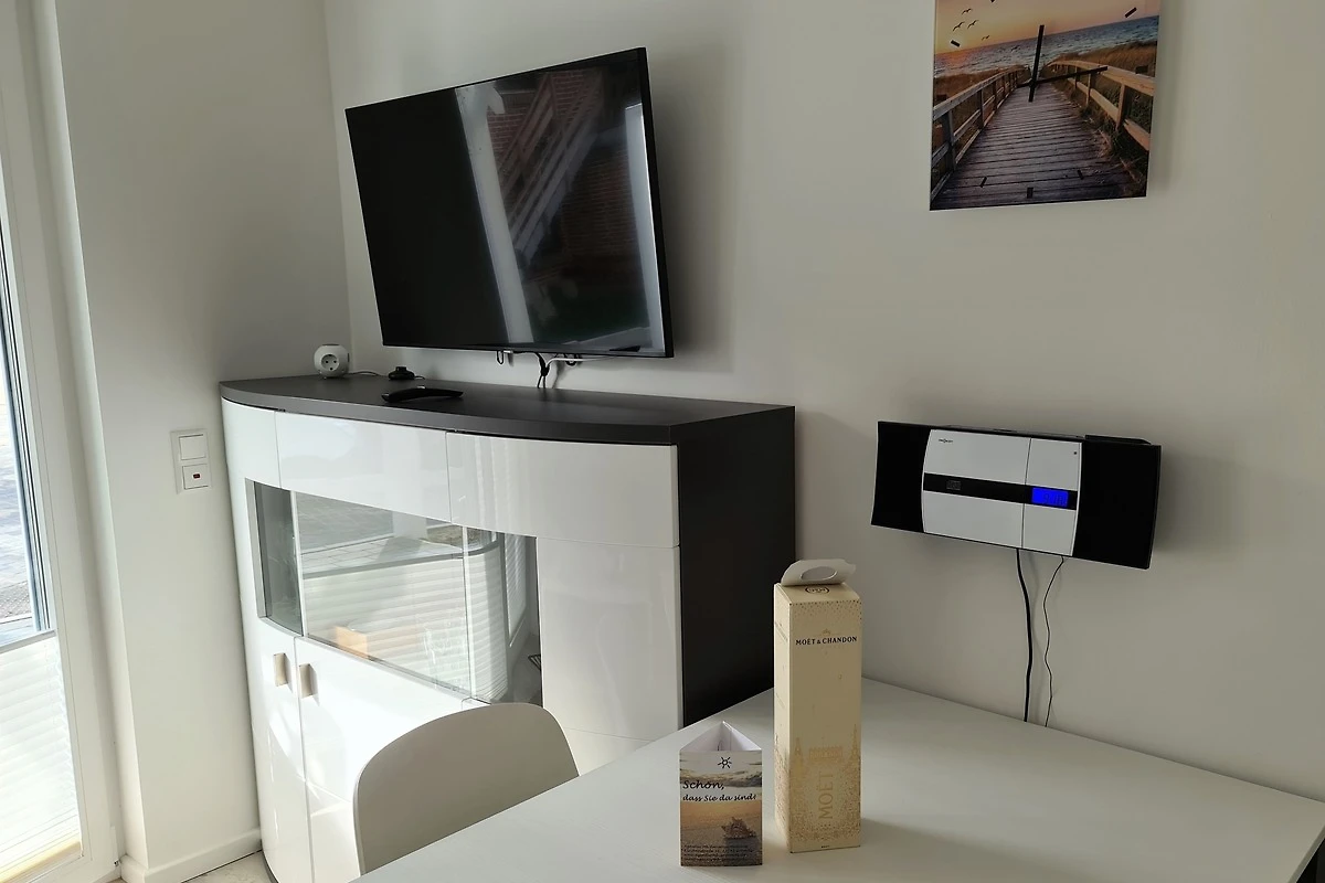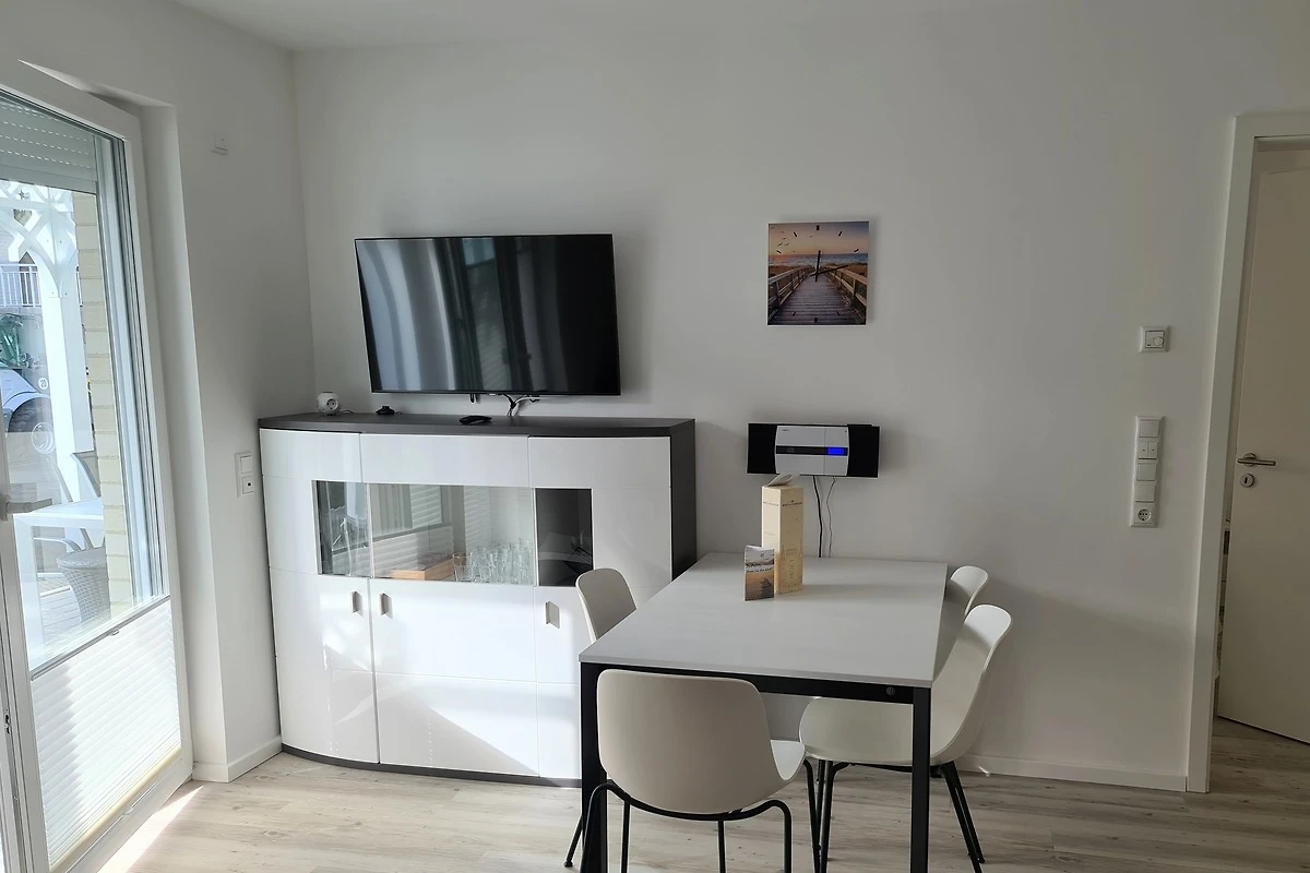 Im Innenbereich erwartet Sie ein Wohnzimmer mit einer Essecke mit vier Sitzplätzen. Die Einrichtung ist liebevoll ausgewählt, gemütlich arrangiert, modern und hochwertig. Eine Musikanlage und ein Smart-TV mit Internetanbindung bieten Unterhaltung und Entertainment. Die bodentiefen Fenster sorgen für lichtdurchflutete Wohnräume und die Terrasse mit Sitzmöglichkeiten in Süd-West-Lage lädt zum Verweilen ein.