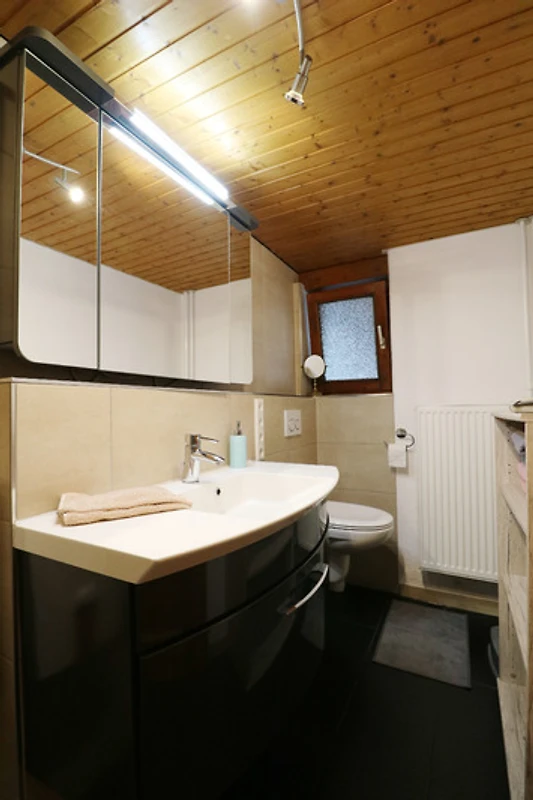 - ein neu renoviertes Bad mit grosser ebenerdiger Dusche, Waschbecken, WC und Waschmaschine