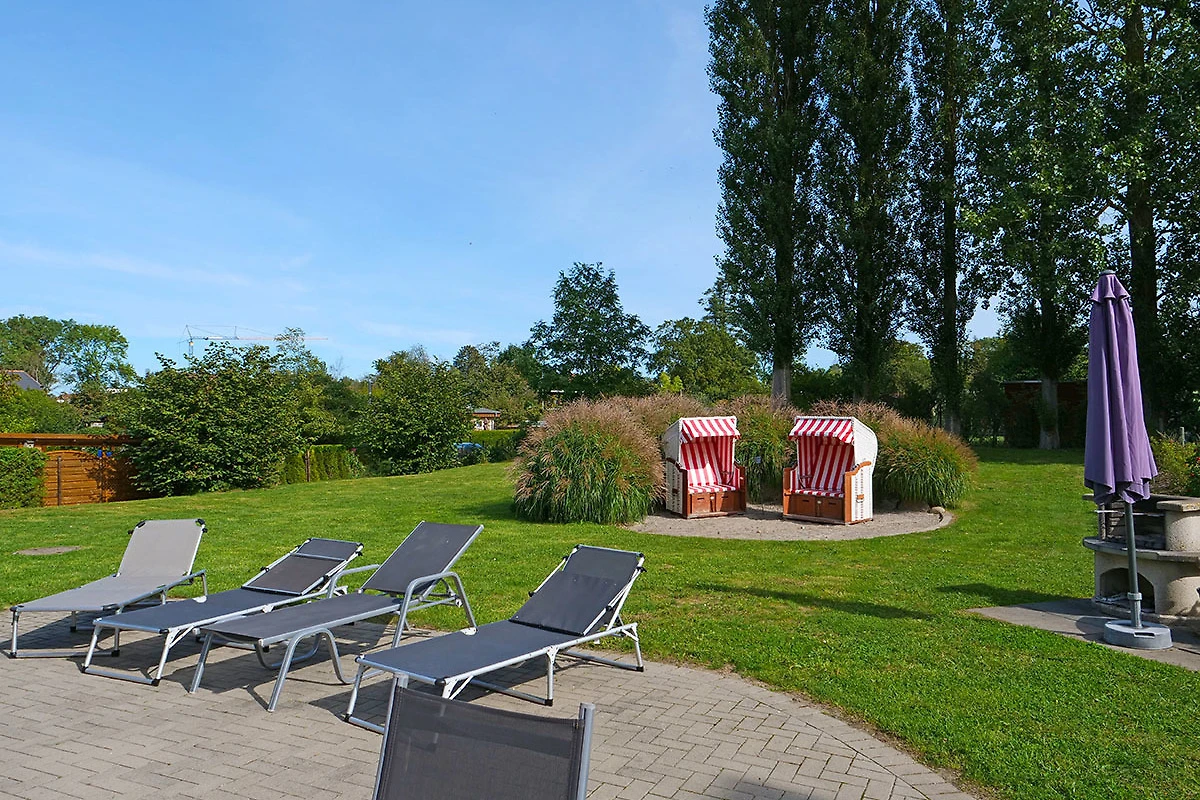Auf der grosszügigen Terrasse in Süd-Ost-Ausrichtung können Sie sich herrlich entspannen und die Sonne geniessen. Ein Strandkorb und ein Gartengrill stehen ebenfalls zur Verfügung. Für zusätzliche Entspannung sorgt die gemütliche Aussensauna (Nutzung gegen Gebühr über Münzer).