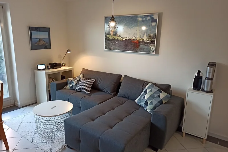 Im Zentrum des 40m² grossen Appartements liegt der Wohnbereich mit Schlafcouch (140 x 190 cm). Hier können Sie nach einem aktiven Tag wunderbar die Füsse hochlegen und vor dem Fernseher den Abend ausklingen lassen.