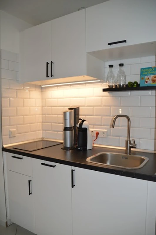Das Schlafzimmer ist ausgestattet mit einem Doppelbett, der Grösse 180 x 200 cm. Für Ihre persönlichen Wertgegenstände gibt es in der Wohnung ausserdem einen kleinen Safe. Die bestens ausgestattete Pantryküche bietet alles, was Sie für die Selbstversorgung benötigen. Ein Cerankochfeld sowie eine Geschirrspülmaschine sind ebenso vorhanden, wie ein Kühlschrank mit eingebautem Gefrierfach, welcher auch für grössere Lebensmitteleinkäufe genügend Platz bietet. Natürlich stehen Ihnen auch viele Küchengeräte zur Verfügung, wie eine Kaffeemaschine, ein Mixer, ein Wasserkocher und ein Toaster.