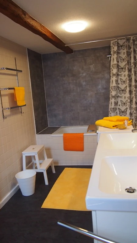 Badewanne mit Dusche, WC, Doppelwaschtisch, Waschmaschine, Fön