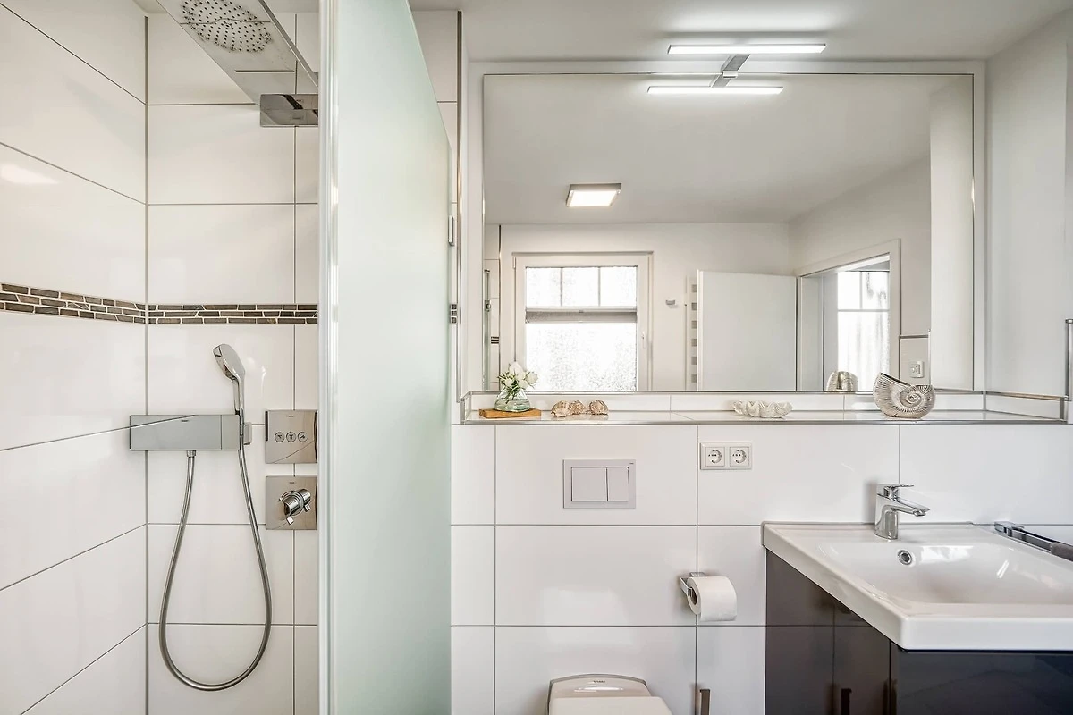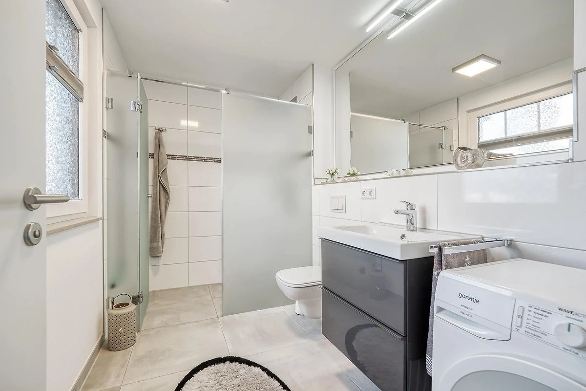 Das Badezimmer mit Fenster verfügt über eine grosse, ebenerdige mit einer Glaswand abgetrennte hochwertige Regen-/Schwalldusche. Hier gibt es darüber hinaus eine Waschmasche sowie einen Föhn. Wäscheständer, -klammern und -korb finden Sie im Fahrradschuppen.