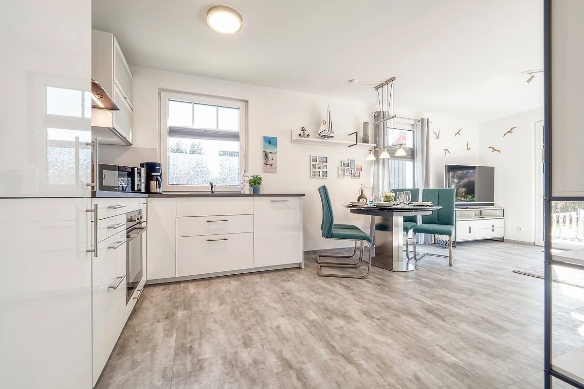 Alle Räume gehen von dem mit einer Garderobe und Schuhschrank ausgestatteten Flur ab. Das geräumige Wohnzimmer mit ausklappbarem Sofa-Bett (160 cm breit) erreichen Sie durch einen offenen Durchgang. In der integrierten Küchenzeile findet man alles, was für eine Selbstverpflegung benötigt wird, so z. B. auch einen Gefrierschrank.