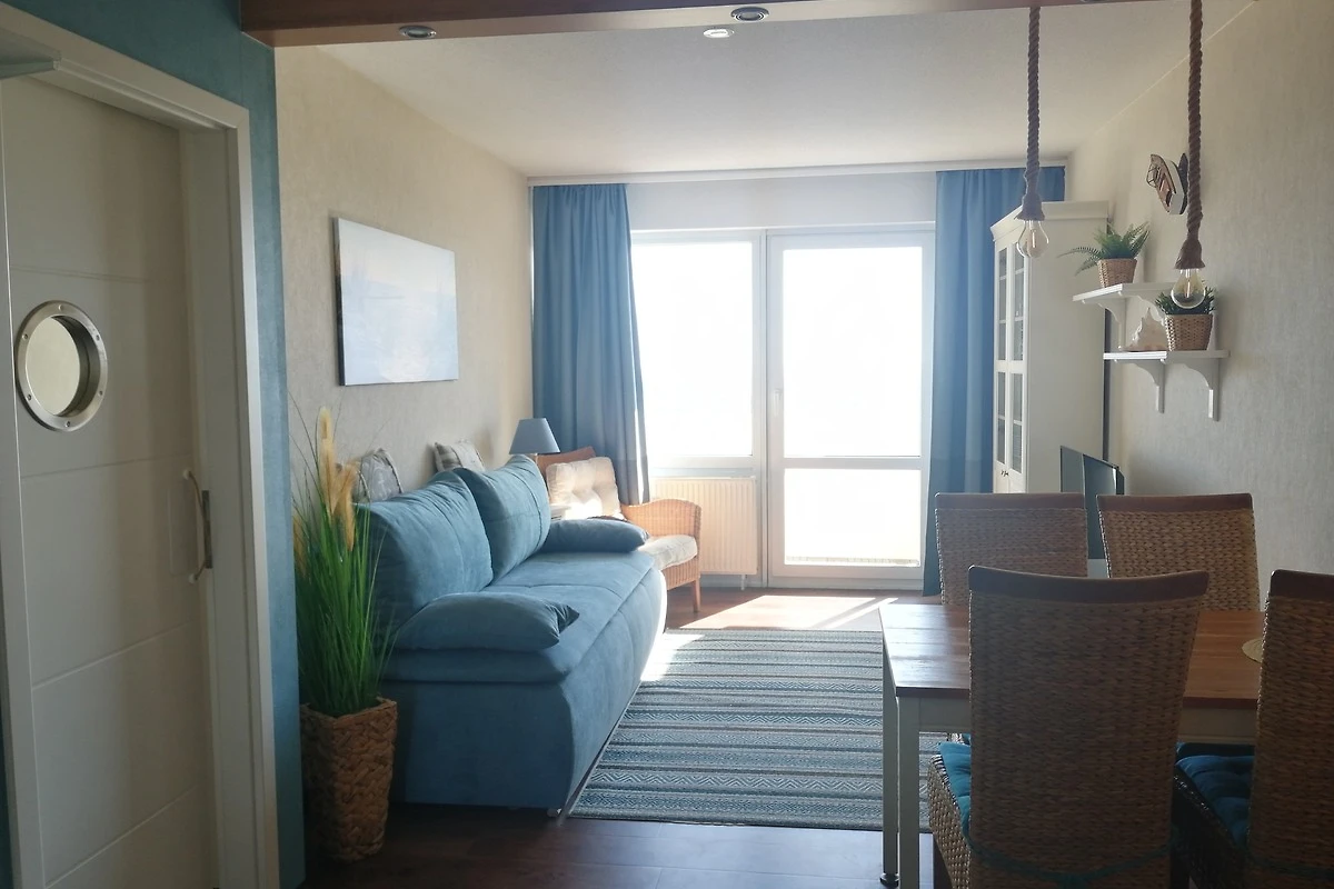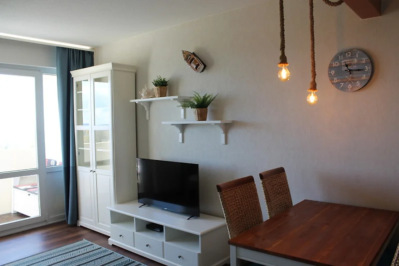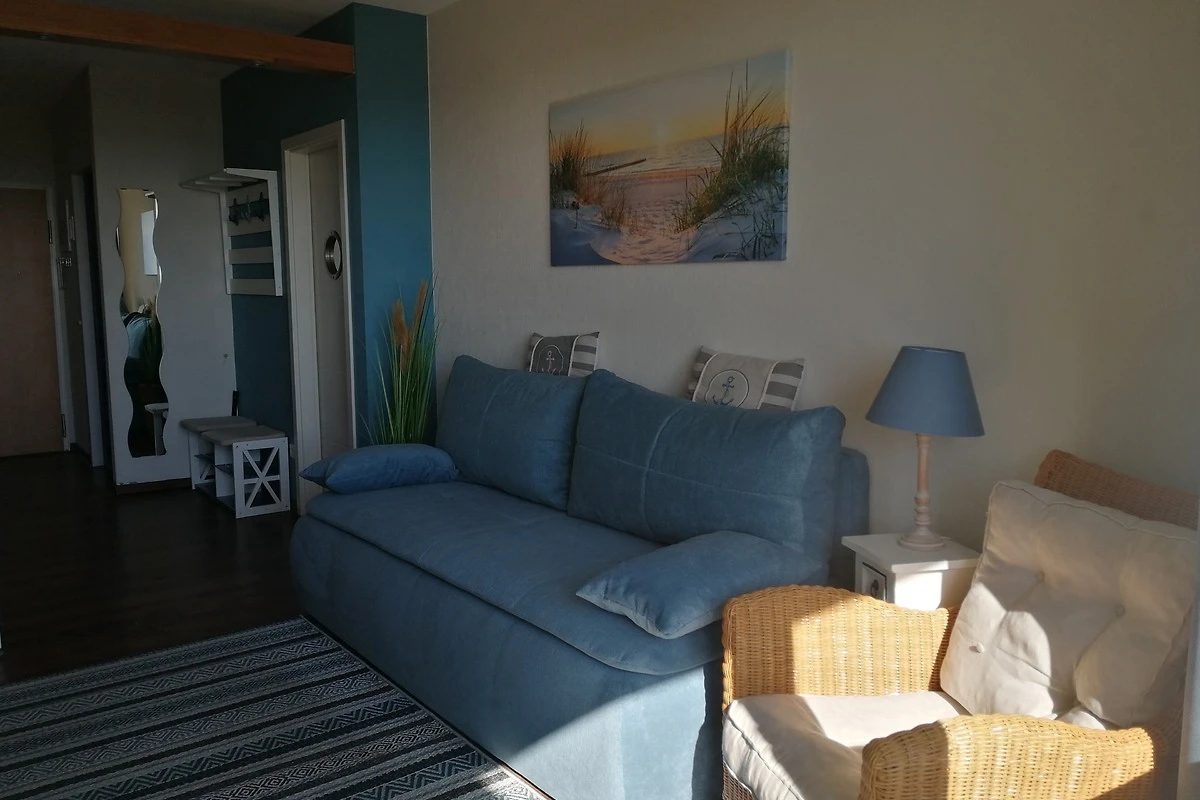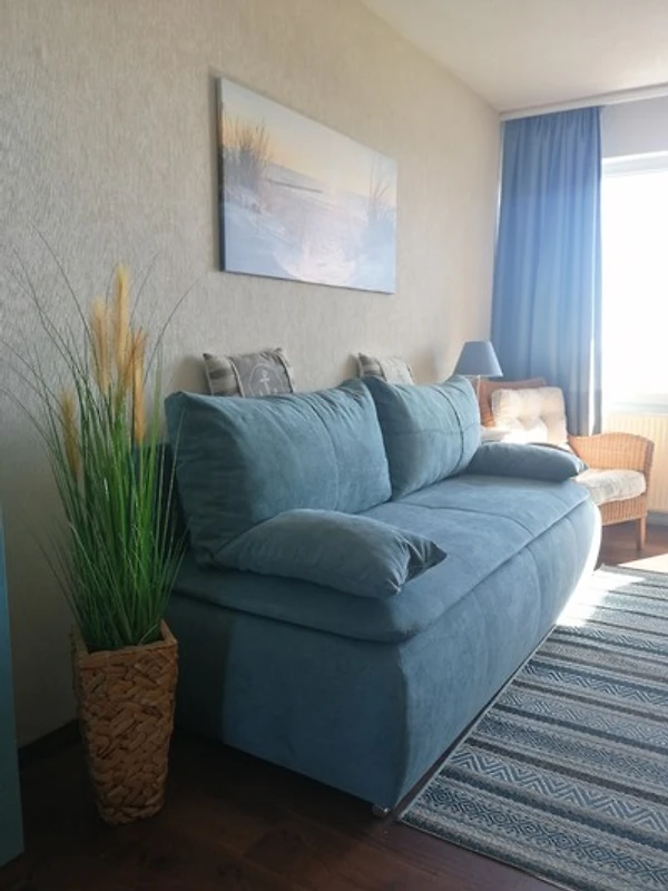 Im Wohnbereich befinden sich ein Sideboard mit Fernseher, DVD- Player, Radio mit CD-Player. Ein breites Sofa, das sich mit wenigen Handgriffen in eine bequeme 1,60 x 2,00 Meter grosse Schlafcouch verwandeln lässt.