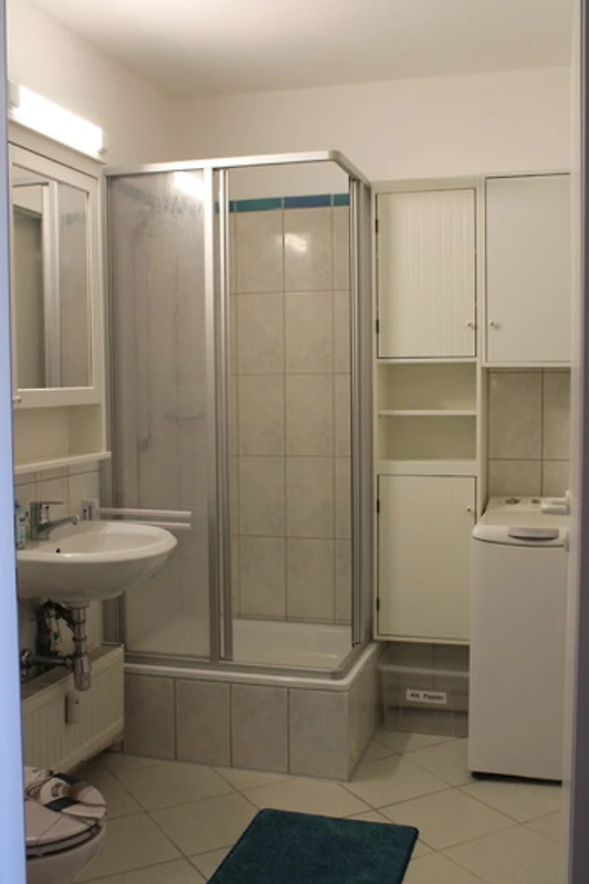 Im geräumigen Badezimmer mit Dusche und WC befinden sich ein Spiegelschrank mit Beleuchtung sowie ein weiterer Schrank und Waschmaschine.