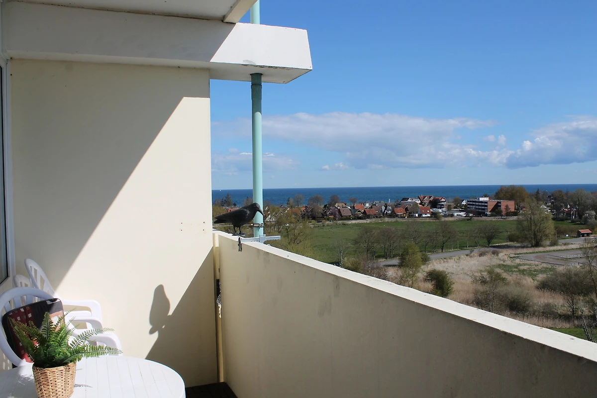 Auf dem grossen überdachten Balkon mit Meerblick befindet sich neben einem Tisch mit 4 Stühlen auch eine Sitzbank.