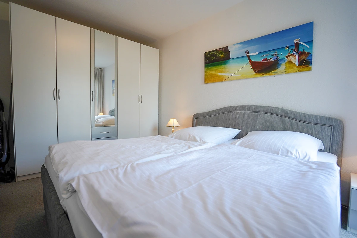 Diese 2-Zimmer-Ferienwohnung bietet ausreichend Platz für 4 Personen. Das separate Schlafzimmer ist mit einem bequemen Doppelbett und einem grossen Kleiderschrank ausgestattet.