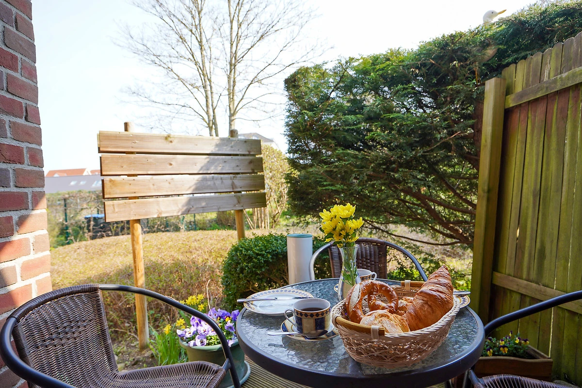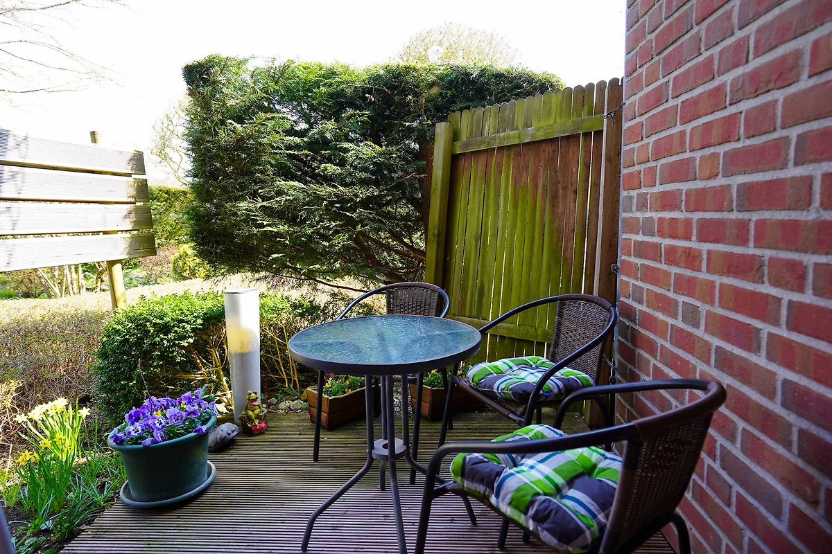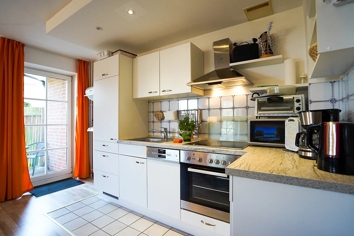 Vom Wohn-/Essbereich mit integrierter, gut ausgestatteter Küche geht es direkt auf die kleine Terrasse.