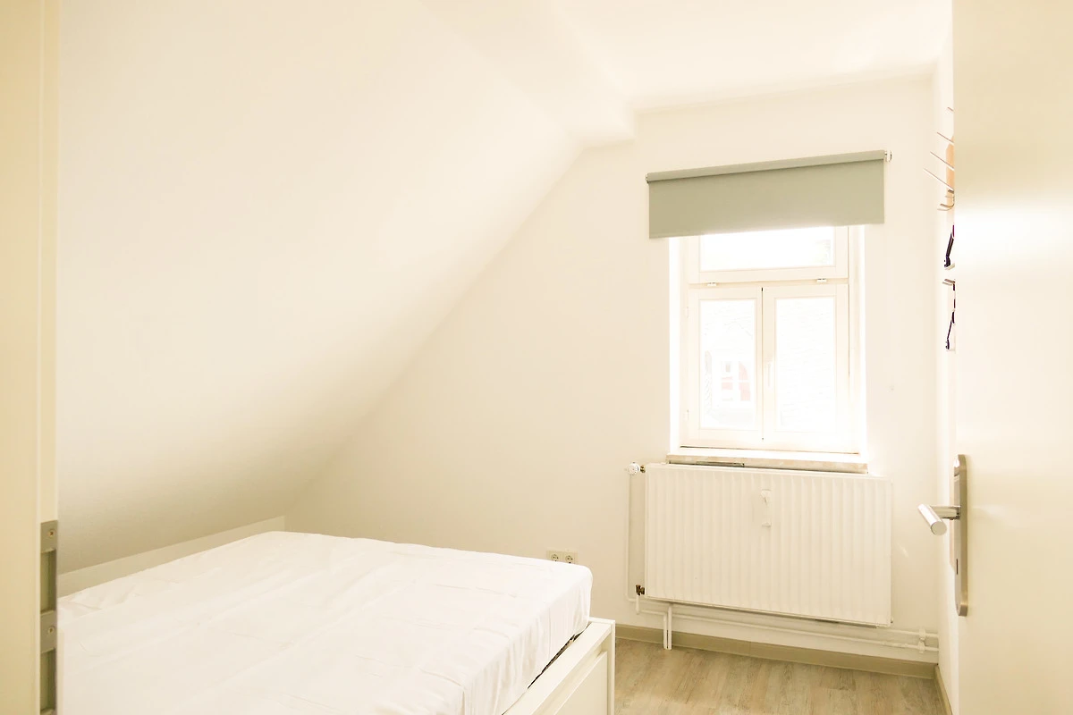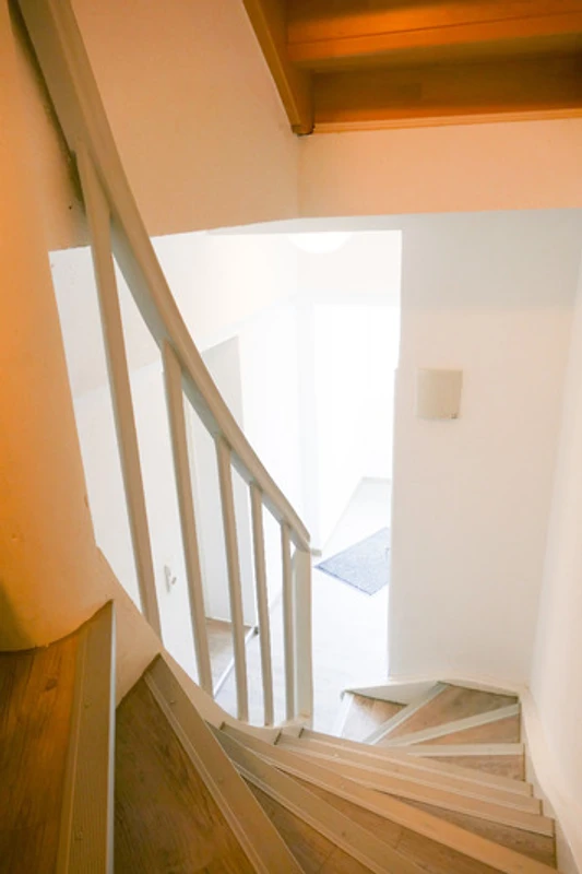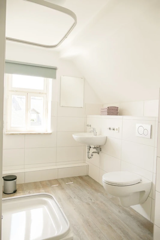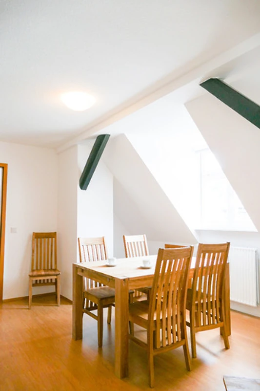 Die Dachgeschosswohnung bis 3 Personen bietet zwei Schlafzimmer, ein Doppelzimmer mit Doppelbett, ein weiteres kleines Doppelzimmer mit einem King Size Bett (Dachschräge) Bad mit Dusche WC, Esszimmer/Küche mit Esstisch für 6 Personen, Modern ausgestattete Küche mit Ceranfeld-Herd, Backofen, Kühlschrank mit Gefrierfach, Mikrowelle, Wasserkocher, Spülmaschine, Toaster, Kaffeemaschine und den üblichen Küchenutensilien wie Pfanne, Töpfe, Geschirr, Gläser Besteck.