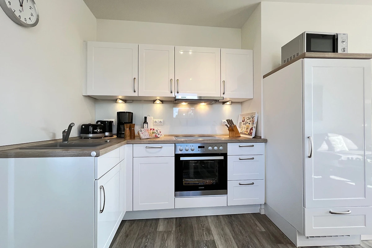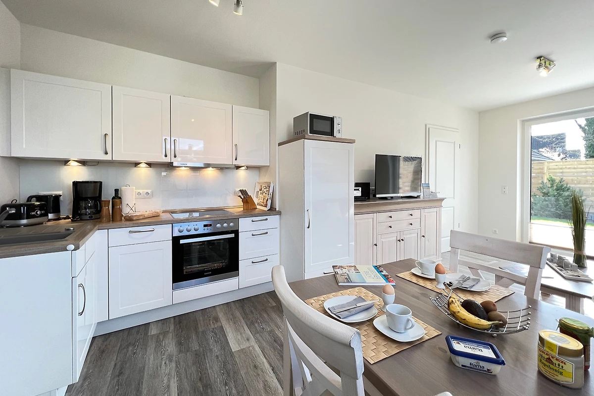 Die schöne 3-Zimmerwohnung für 2-4 Personen mit eigenem Eingang befindet sich im Erdgeschoss und verfügt über eine in den Wohn-/Essbereich integrierte umfangreich ausgestattete Komfort-Küche (Cerankochfeld, Backofen, Mikrowelle, Spülmaschine, Kühlschrank mit Gefrierfach etc.).