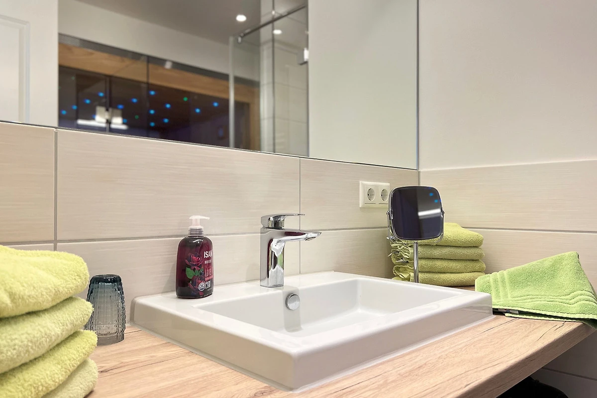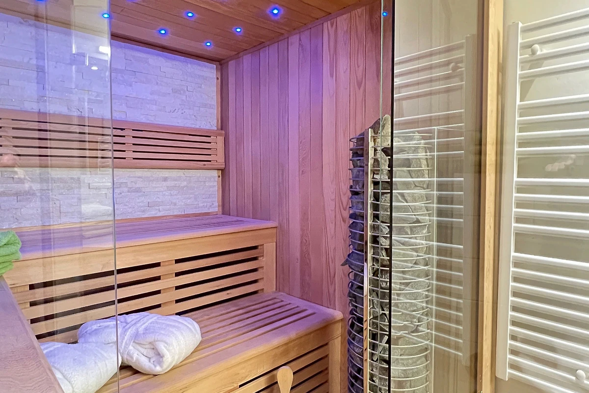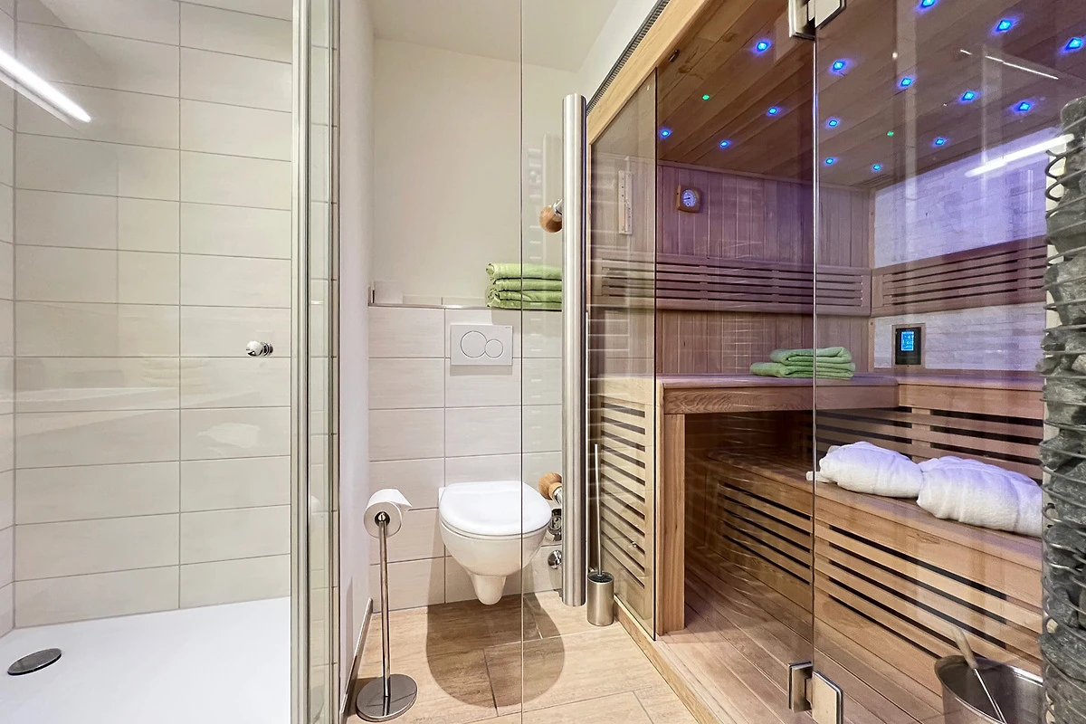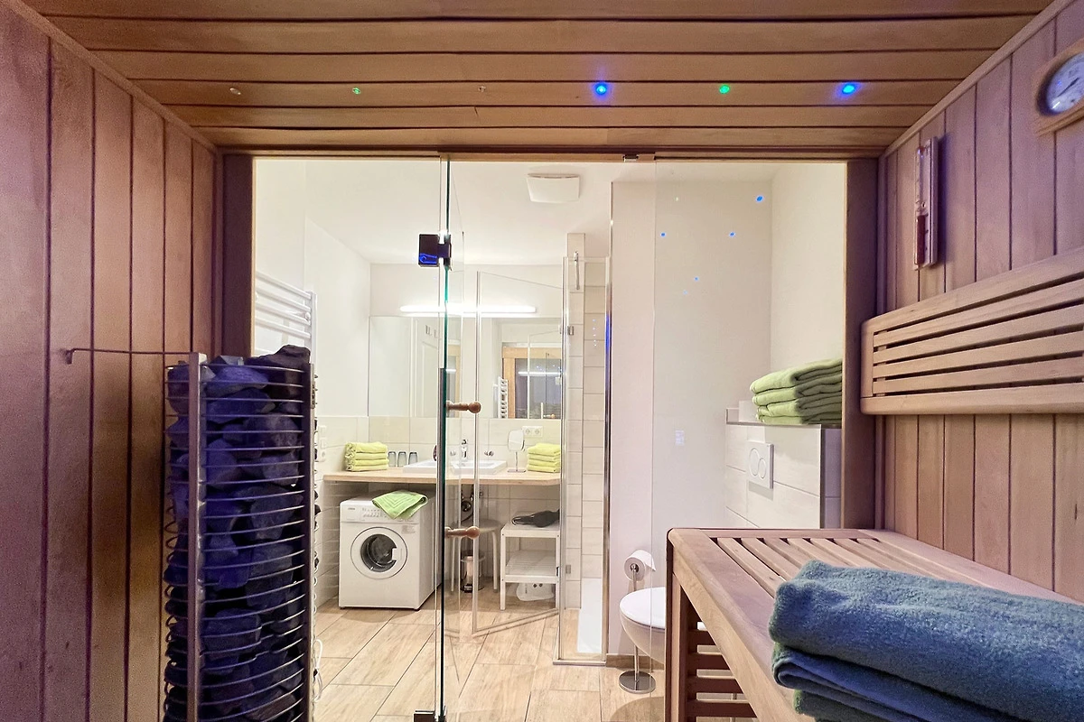 Das Badezimmer liegt zwischen den beiden Schlafräumen. Es ist eingerichtet mit einer ebenerdigen Wellnessdusche und einer Sauna. Eine Waschmaschine ist ebenfalls vorhanden.