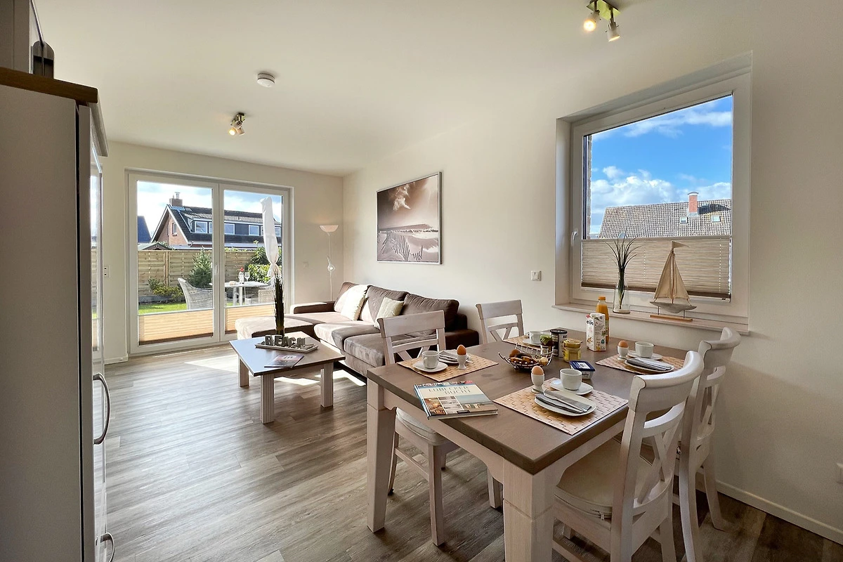 Vom Flur aus gelangt man in das sonnen-helle Wohn- und Esszimmer (mit Flachbild-TV, Hifi-Anlage und kostenlosem Internetzugang). Der komfortable Wohnbereich ist mit hellen modernen Möbeln ausgestattet. Von dort aus gelangt man auf die grosszügige Süd-Terrasse (2 Wellnessliegen, Terrassenmöbel, Sonnenschirm).
