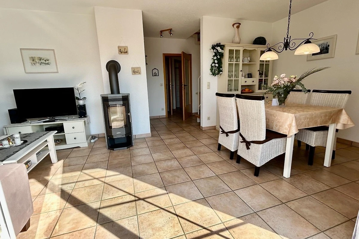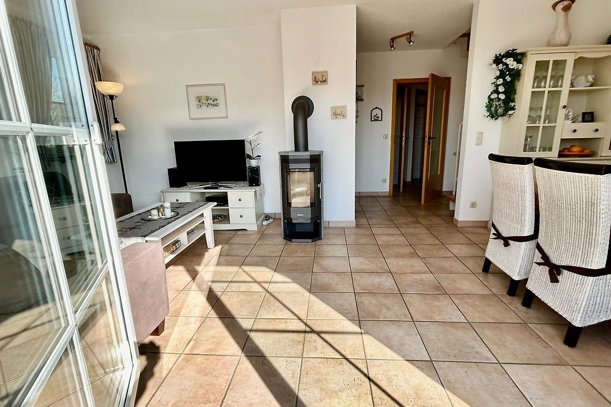 Die Wohnung hat 2 Schlafzimmer, Wohnbereich mit offener Küche, Essbereich und Kaminofen, von hier aus gelangt man auf den Balkon.