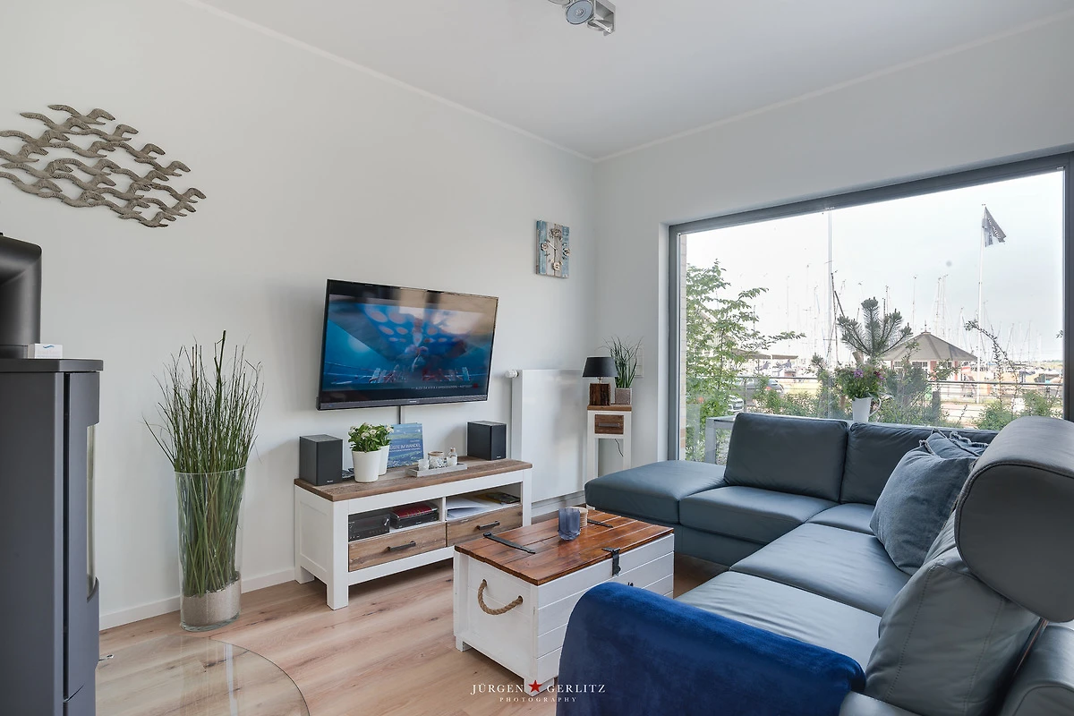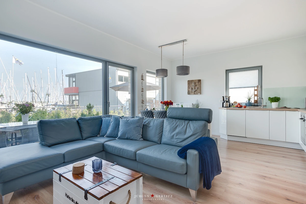 Aus dem gemütlich eingerichteten Wohnzimmer mit Kamin und der sehr gut ausgestatteten offenen Küche mit grossem Esstisch haben Sie einen traumhaften Blick auf den Yachthafen. Das Wohnzimmer ist mit einem grossen Flachbild TV, einer Musikanlage und einer Playstation Spielkonsole ausgestattet.