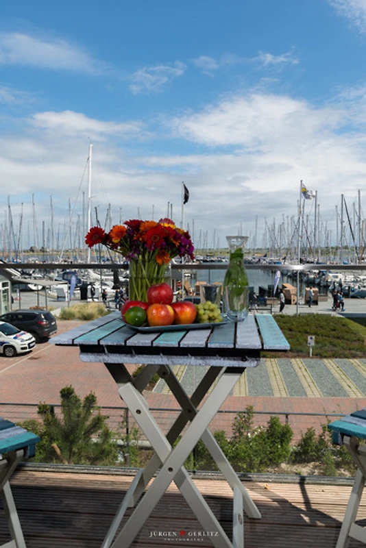 Auf der Aussenterrasse der Wohnung befindet sich eine grosse Sitzlounge samt Esstisch, sowie ein Strandkorb und eine Sonnenliege. Der Ausblick auf Hafen und die Promenade ist auch hier inklusive.