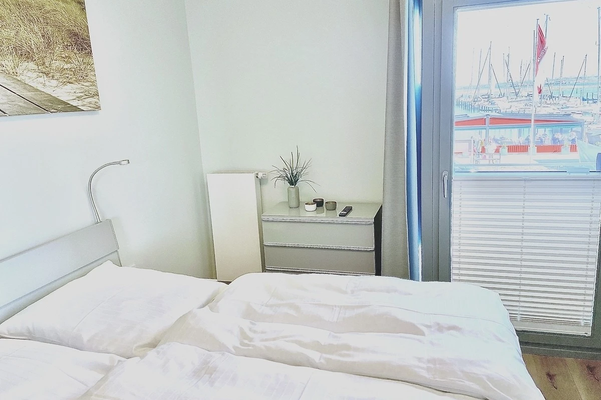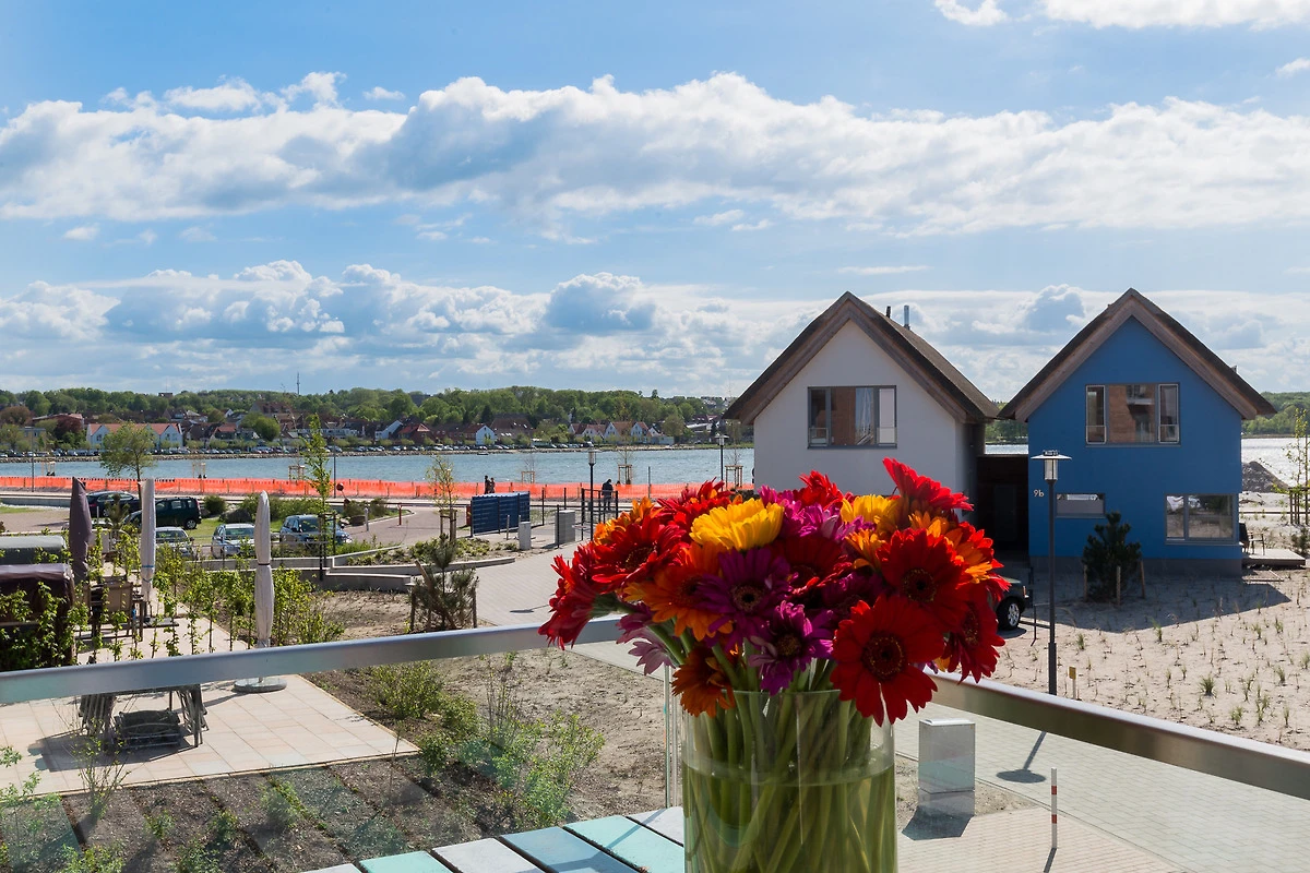 Aus einem der grossen Schlafzimmer mit Doppelbett (160x200cm) und vom grossen Balkon geniessen Sie den Ausblick auf den Yachthafen, morgens umschmeichelt von einem traumhaften Sonnenaufgang über dem Wasser.