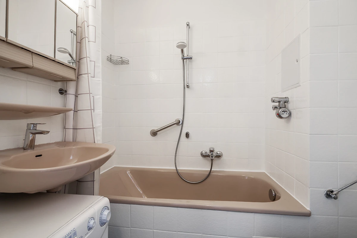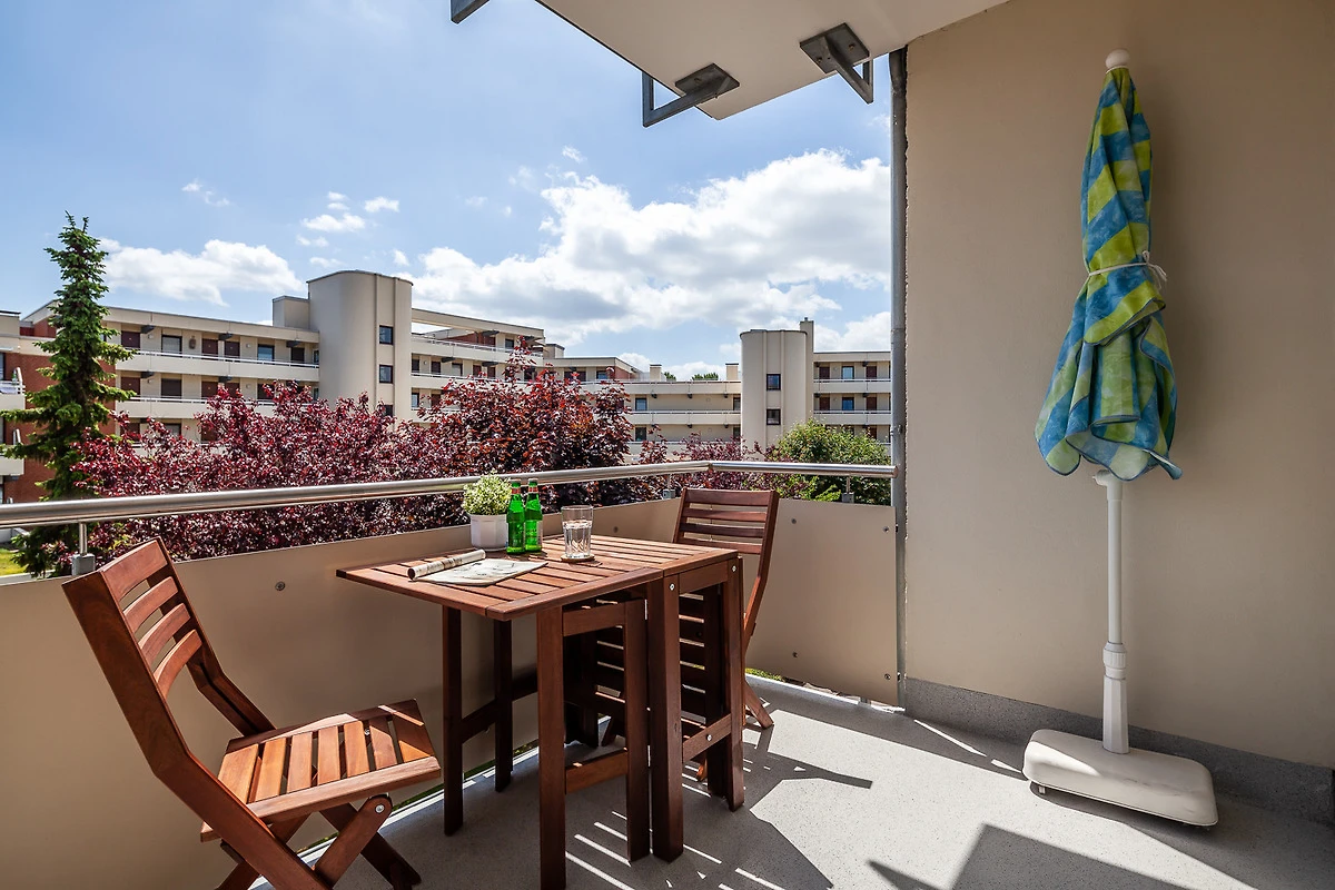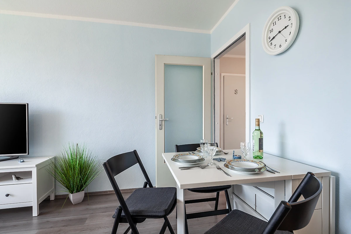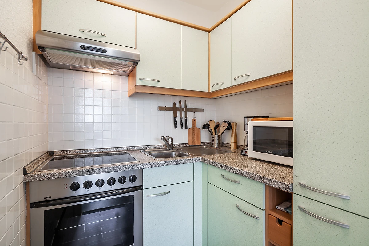 Das Wohnzimmer ist mit einer neuwertigen Schlafcouch, einem Esstisch und einem grossen Fernseher ausgestattet. Auf dem Balkon, welcher über einen Tisch mit Stühlen verfügt, können Sie die Sonne geniessen. Ein teilweiser Seeblick ist hier inbegriffen. Die kleine separate Küche beinhaltet alle notwendigen Küchengeräte.