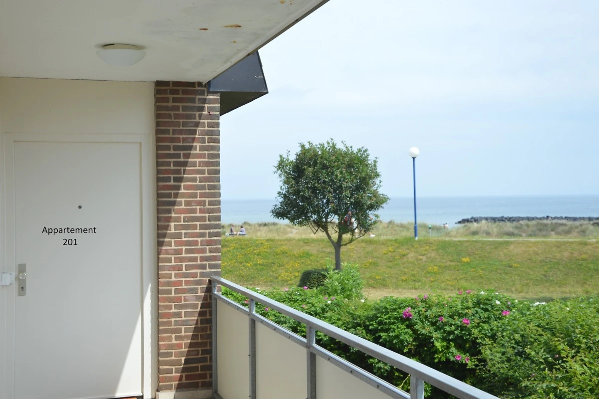 Das Schlafzimmer mit Doppelbett verfügt über eine zusätzliche kleine Essecke, denn von hier und natürlich auch vom Balkon können Sie den direkten Blick auf die Ostsee und die Seebrücke geniessen.