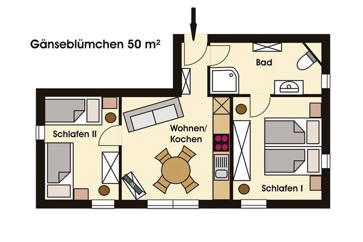 Im Wohnraum befindet sich eine vollausgestattete Küchenzeile (Geschirrspüler, Backofen, Mikrowelle),ein Sofa,TV-Schrank und ein Essplatz. Über den frz.Balkon blicken Sie Richtung Garten und Spielplatz. Mehrere Sitzmöglichkeiten im Garten sind vorhanden. Kinderausstattung erhalten Sie bei uns kostenfrei (bitte vorbestellen).