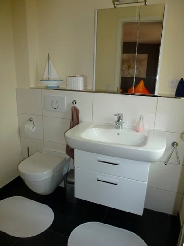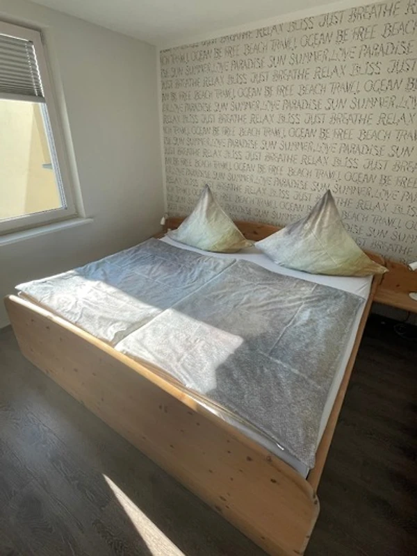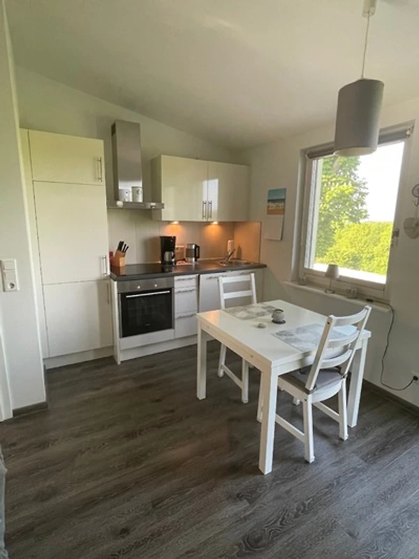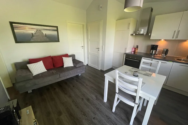 Wie sieht sie aus? Aus dem Eingangsbereich mit Garderobe im Erdgeschoss gelangen Sie durch das eigene Treppenhaus ins Obergeschoss und in die eigentliche Wohnung. Sie finden dort das Wohnzimmer mit kleiner, offener Küche, ein Schlafzimmer und das Tageslichtbad mit WC und Dusche. Die Ausstattung beinhaltet neben der komplett eingerichteten Küche (Spülmaschine, Backofen, Kochstelle, Kühlschrank mit Eisfach) auch SAT-TV, Audiosystem mit Radio und CD-Player, Internetzugang, Schlafsofa (aufklappbar) im Wohnzimmer, Doppelbett im Schlafzimmer, Fön im Bad. Auf Wunsch zustellbares Kinderbett. Die Wohnung wird komplett über Fussbodenheizung beheizt.