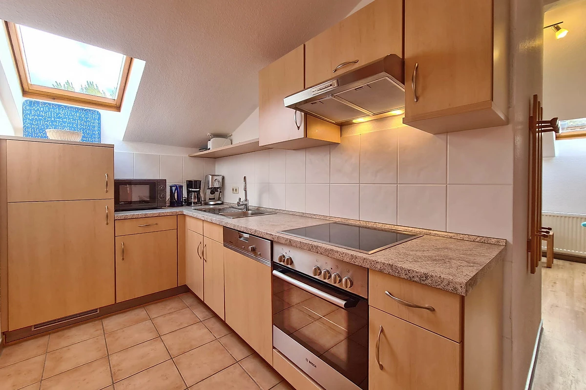 Küche mit Geschirrspüler,4- Plattenherd, Backofen, Dunstabzug, Kühlschrank, Mikrowelle, Wasserkocher, Kaffeemaschine, Kühlgefrierkombi.