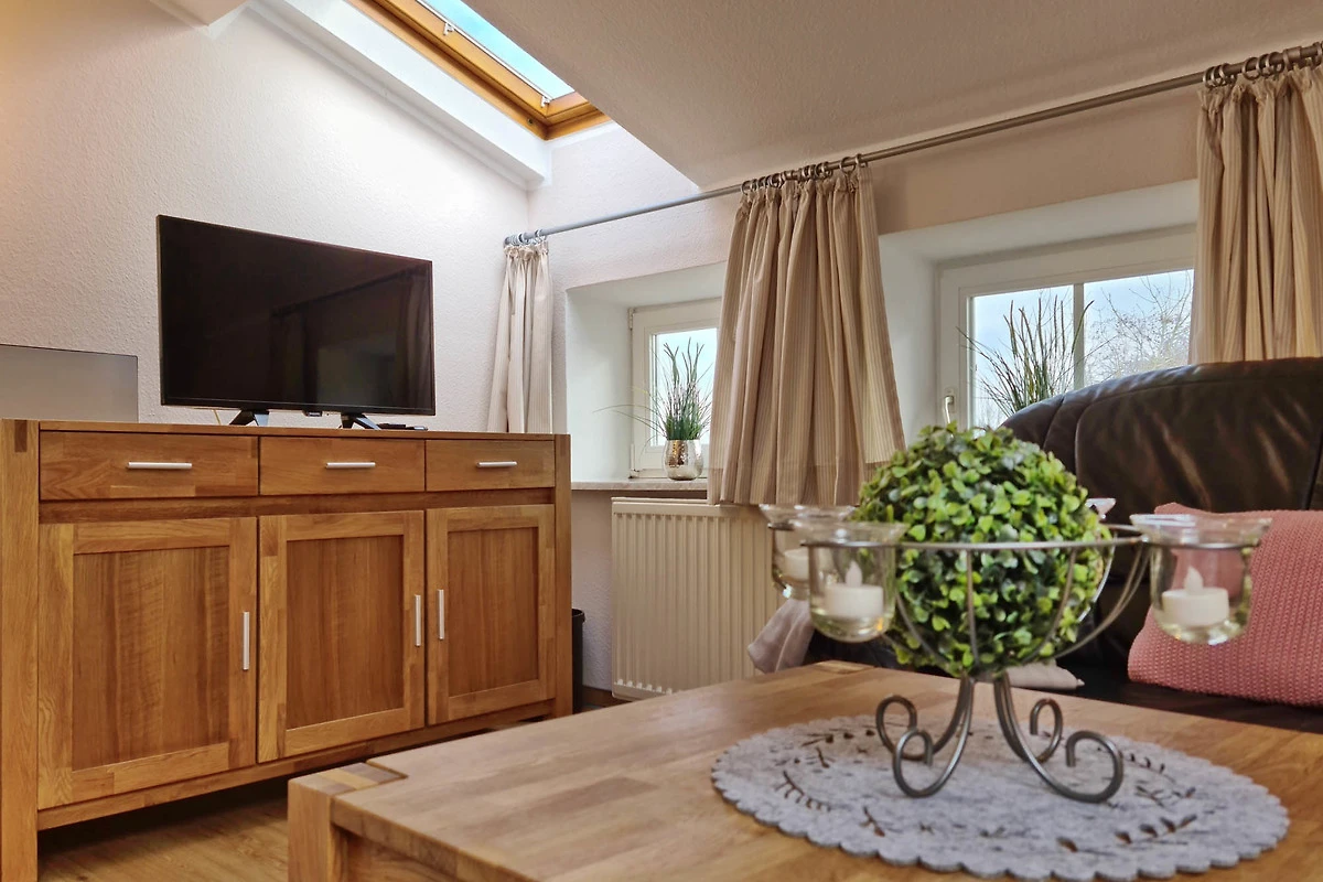Ein Wohnzimmer mit Sitzecke, sowie Essecke, Sat-TV, Stereoanlage.