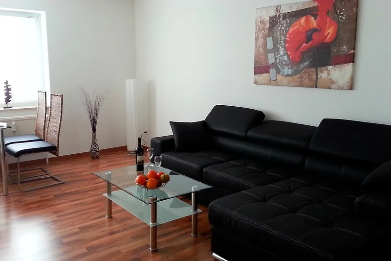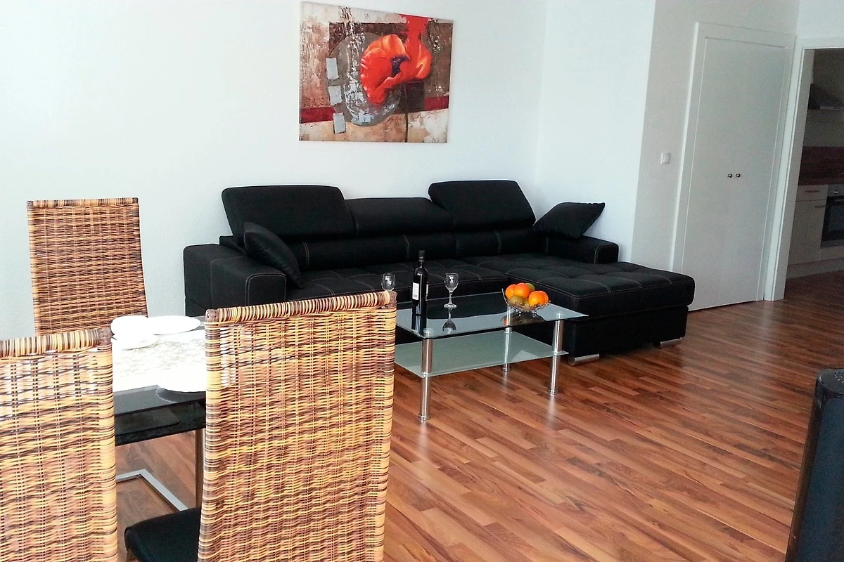 Im stilvollen Wohnzimmer befinden sich eine gemütliche Sitzecke, ein moderner Flachfernseher mit Kabelanschluss und ein Essplatz für 4 Personen. Ein integrierter Wandschrank schafft zusätzlichen Stauraum. Das gemütliche Schlafzimmer hat ein Doppelbett für 2 Personen mit neuen 7-Zonen-Matratzen. Zusätzlich hat die Wohnung ein Gästeluftbett (bläst sich selbst auf) für 2 weitere Personen. Die moderne Küche mit Hochglanzfronten ist mit einem Kühlschrank, Geschirrspüler, Backofen und Cerankochfeld ausgestattet. Alle Bodenbeläge sind Allergiker freundlich. Es handelt sich um eine Nichtraucherwohnung.