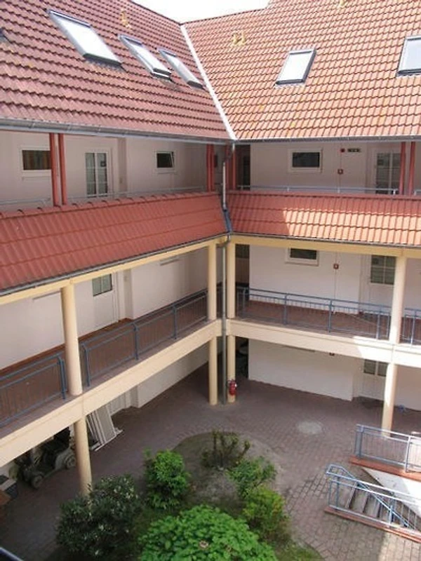 Die Wohnung wird durch einen Laubengang betreten, von wo aus man einen schönen Blick auf den angelegten Innenhof hat. Im Kellergeschoss sind Räumlichkeiten vorhanden, in denen man Sportgeräte unterbringen kann (Fahrstuhl vorhanden). Parkplätze stehen reichlich und kostenfrei zur Verfügung.