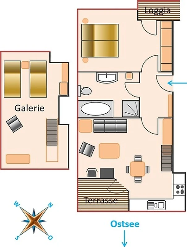 Unsere Ferienwohnung, Seestern 40, liegt im Strandpark Grossenbrode und ist voll auf die Bedürfnisse unserer Gäste ausgerichtet. Die bis ins Detail liebevoll eingerichtete Ferienwohnung erstreckt sich über zwei Etagen.
