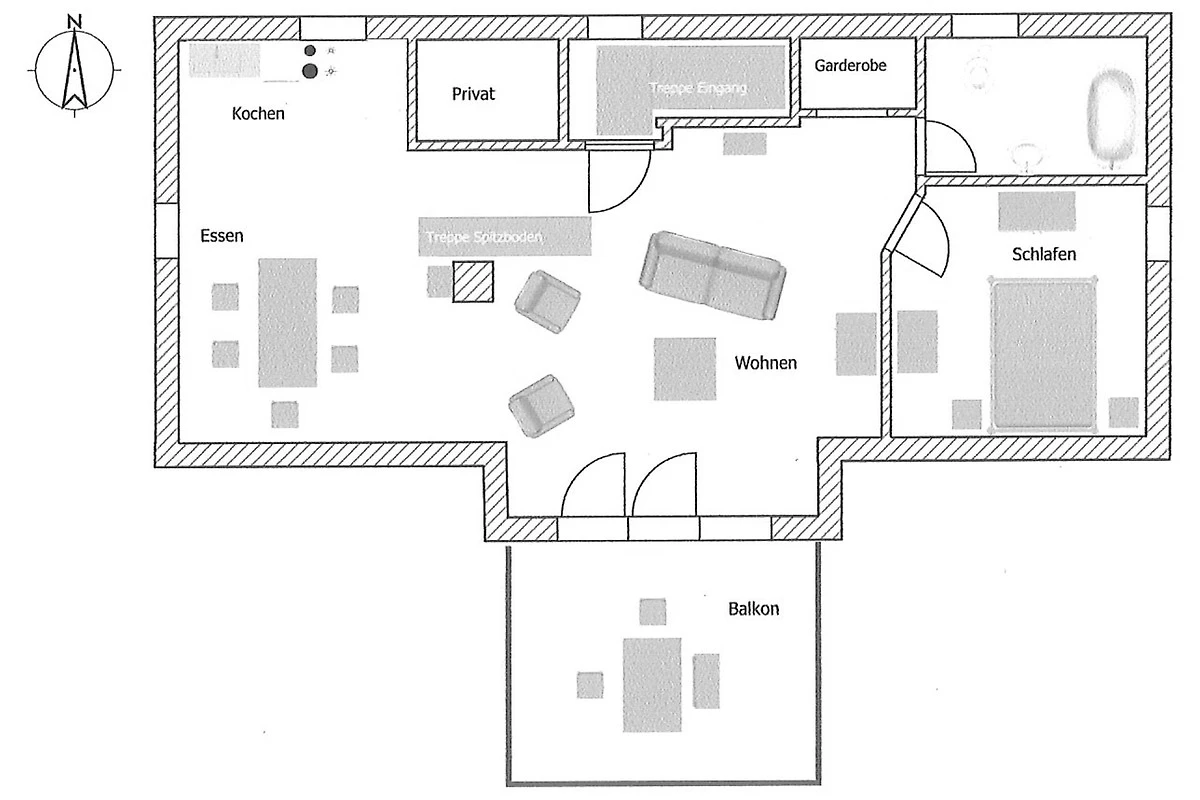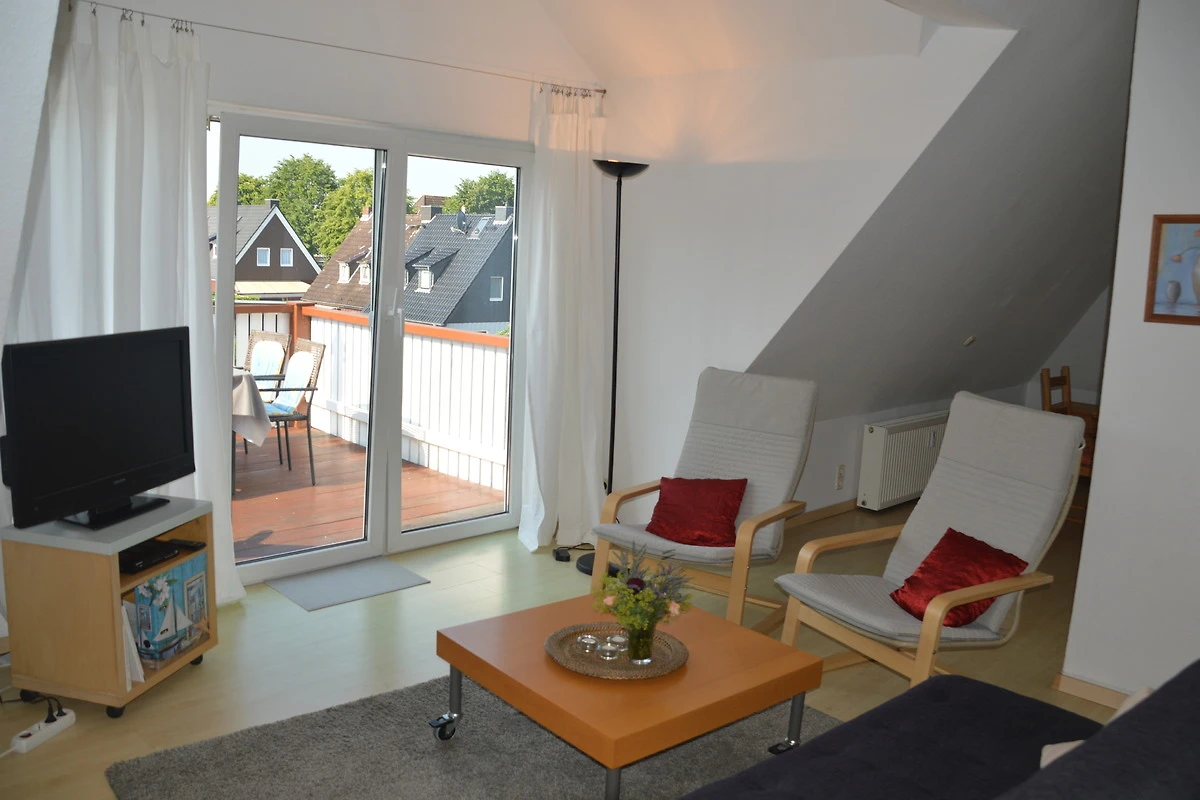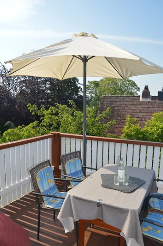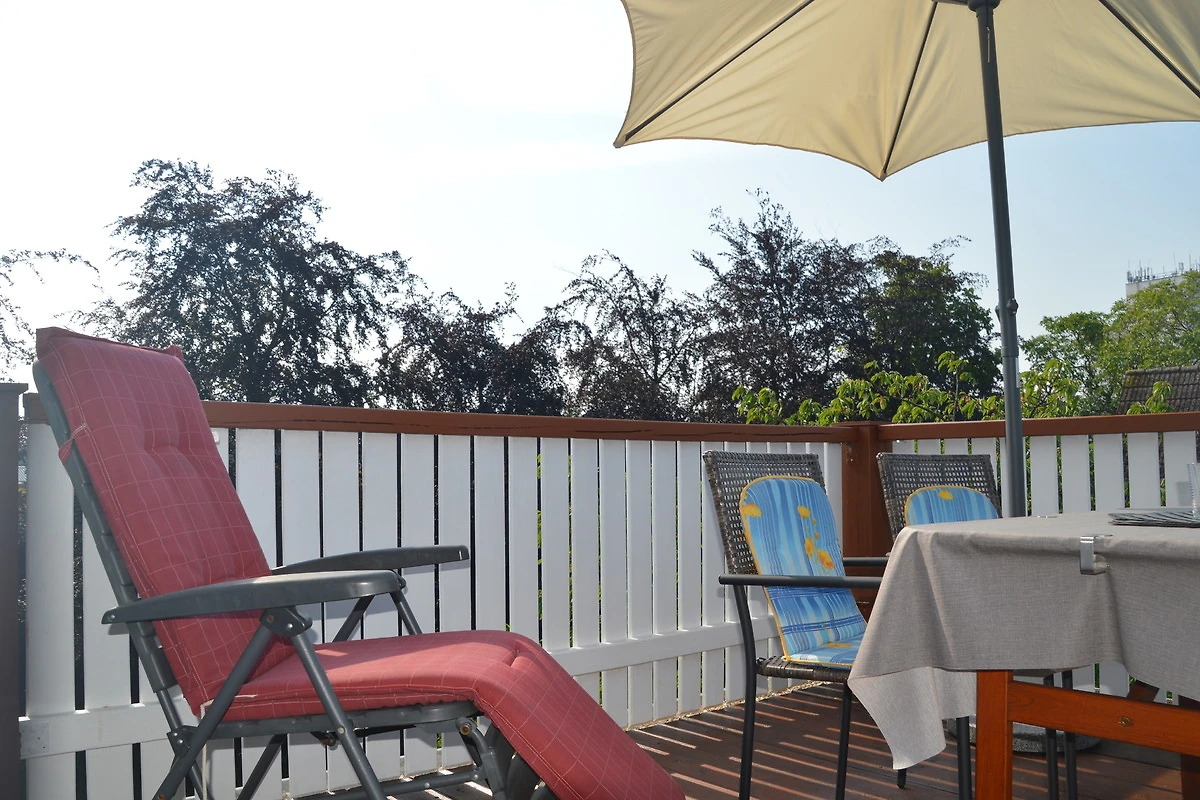 Der zur Wohnung gehörige Balkon ist nach Süden gerichtet. Hier können Sie nachmittags auf dem Liegestuhl relaxen und abends in gemütlicher Runde den Abend ausklingen lassen. Ein Sonnenschirm steht Ihnen als Schattenspender zur Verfügung.
