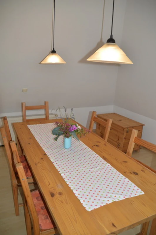 Eine Waschmaschine steht zur gemeinschaftlichen Nutzung im Keller des Hauses bereit. Auf dem Grundstück befindet sich ein KFZ-Stellplatz.