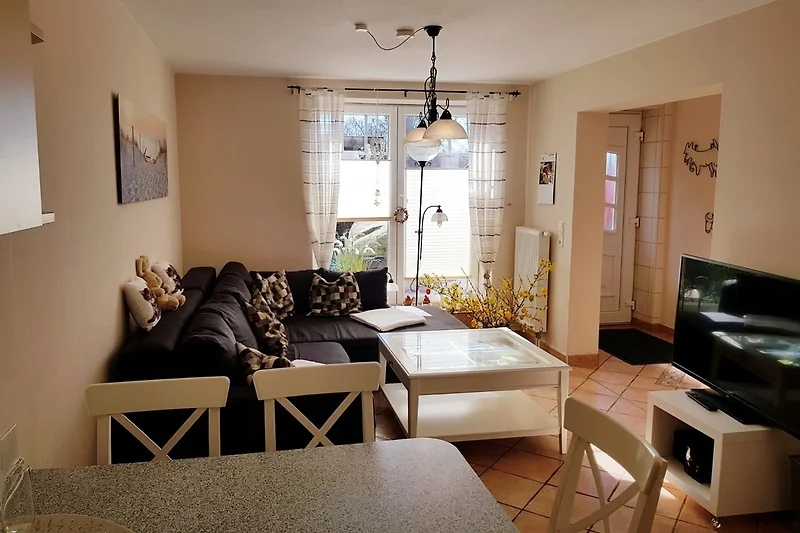 Der gemütliche, nach Süden gelegene Wohnraum strahlt mit seiner hellen, modernen Ausstattung eine pure Wohlfühlatmosphäre aus. Kleine Wohnaccessoires in sanften Naturtönen bringen Harmonie herein.
