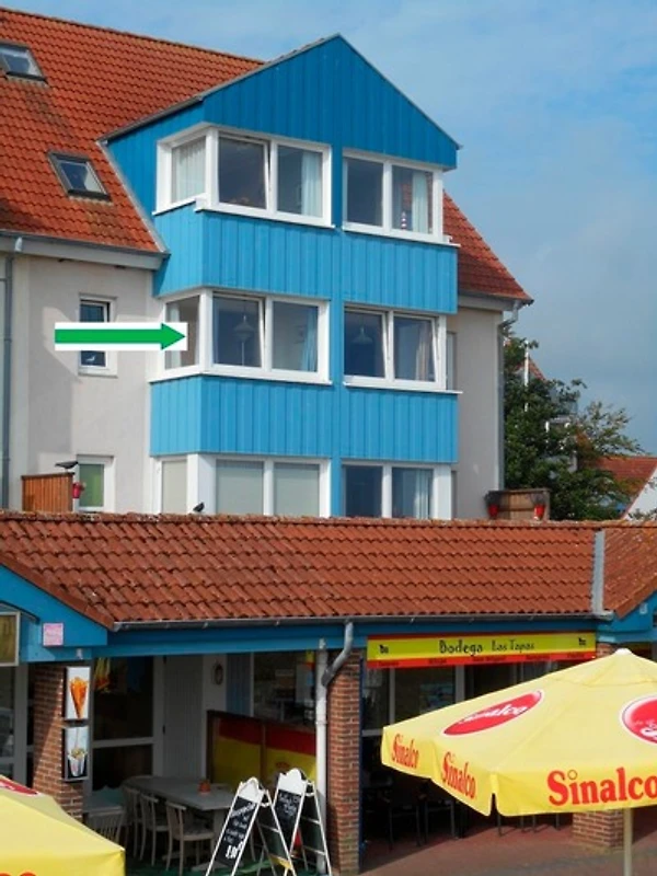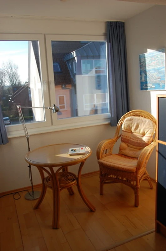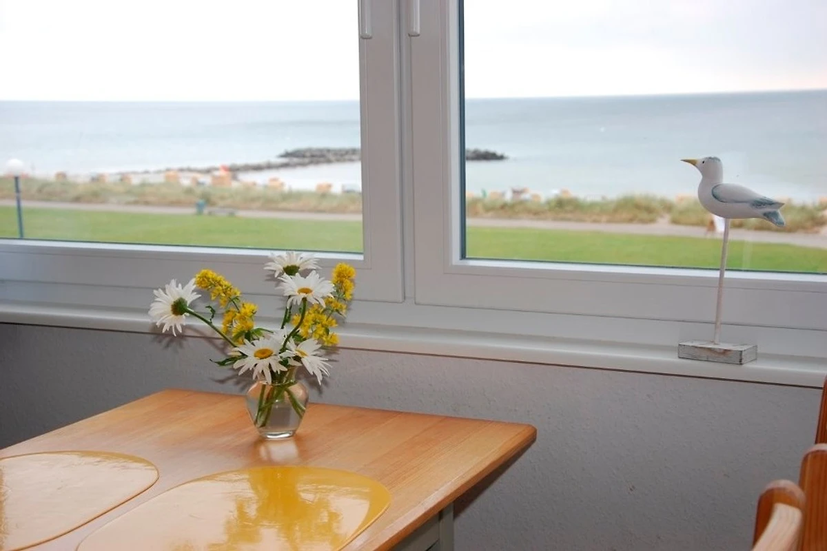 Die rund 42 qm grosse Wohnung bietet Meeresblick pur. Am Esstisch im Erker kann man gemütlich essen, abends ein Glas Wein beim Meeresrauschen am offenen Fenster trinken oder nur aufs Meer mit seinem wechselnden Farbenspiel blicken, man kann Schiffe beobachten oder spielen.